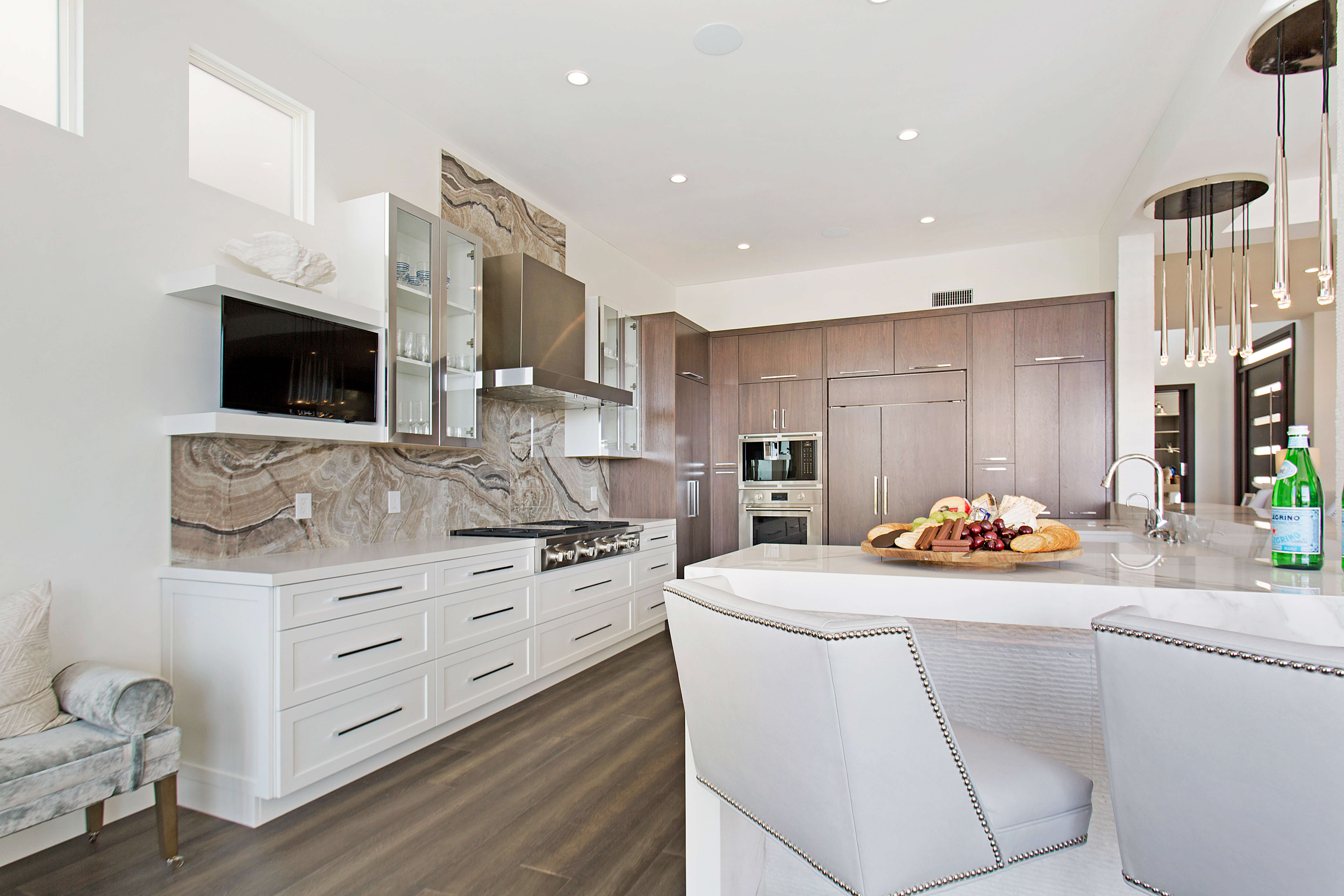 This design features a unique slab door: the Dash door is one of Dura Supreme’s contemporary Textured TFL doors and it’s been mixed with the transitional styling of the Dempsey door in Linen White paint. Both offer a modern look and feel and the Dash door brings visual texture. A beautiful mix!