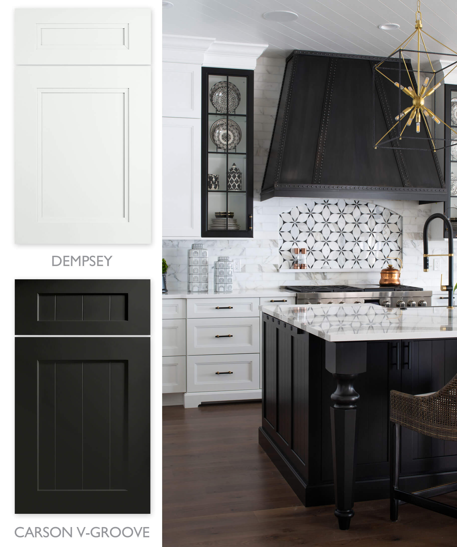 The stunning kitchen below is a traditional design at its best! Not only does it show two popular paint finishes that are timeless, it has two different door styles that complement each other. The perimeter cabinets feature our Dempsey door style in a custom paint (Benjamin Moore “Chantilly Lace” 2121-70 Personal Paint Match) and the kitchen island and fridge panels have Carson V-Groove in Black & Chantilly Lace paint. We are swooning!  A perfect example of mixing doors that have different inside profiles, but blend beautifully because of the matching outside profile and consistent stile and rail size.