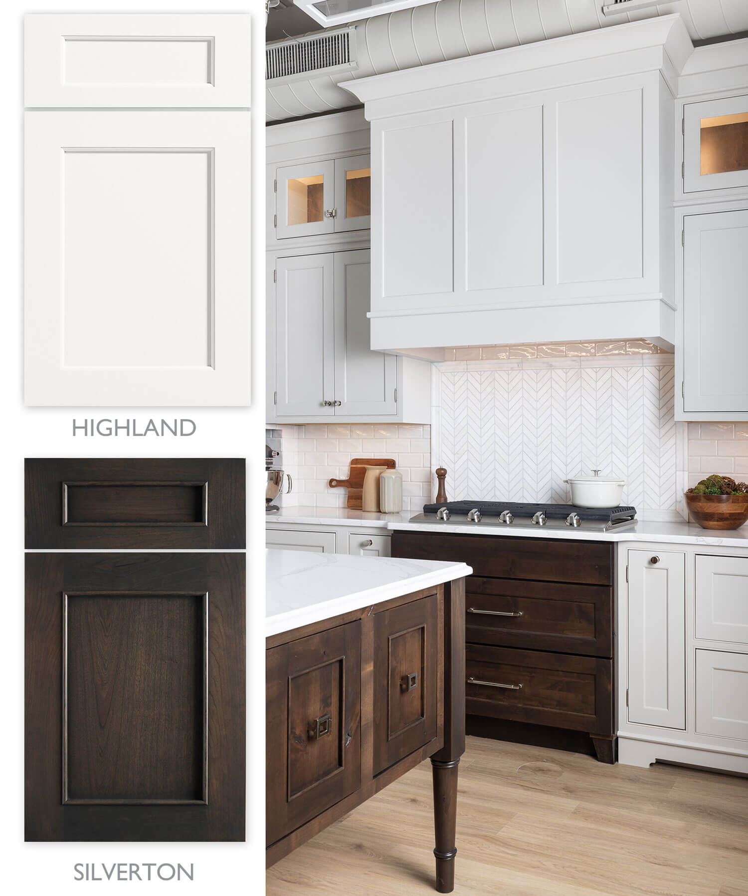 The beautiful traditional design below mixes two inset door styles (Highland and Silverton) that blend beautifully because of the stile and rail size. Both of the doors also offer a decorative inside profile but even though they are not exactly the same, they still mix well in the same kitchen design.