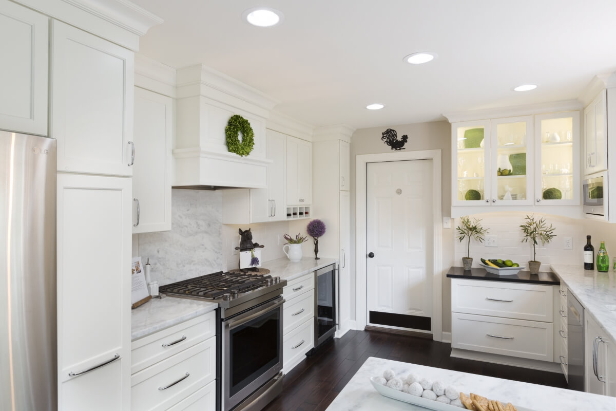 A glamorous all white kitchen design with white painted and gray stained cabinets.