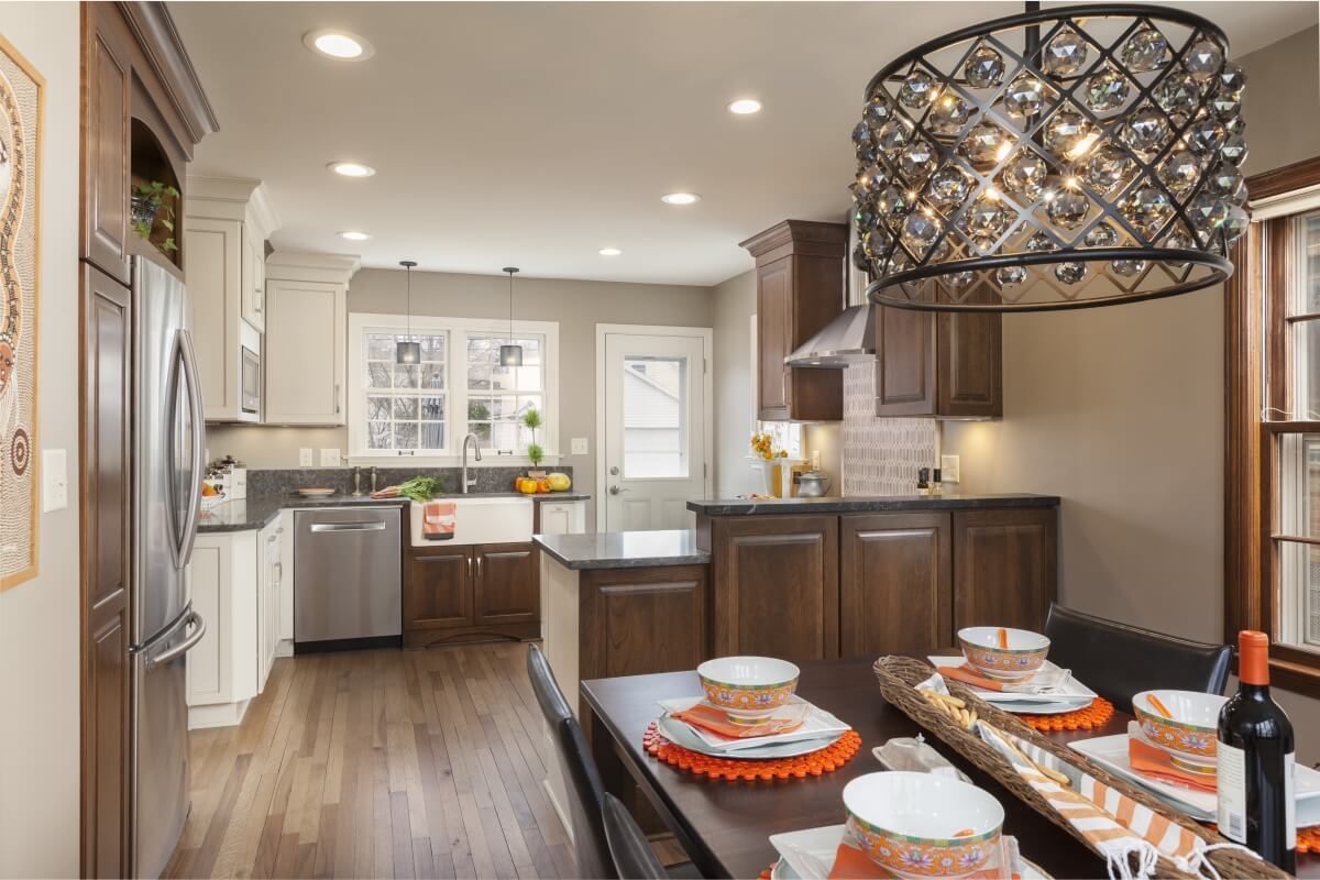 A cozy two-tone G-Shaped kitchen designed by Gwen Adair of Cabinet Supreme by Adair; Photographer Ryan Hainey