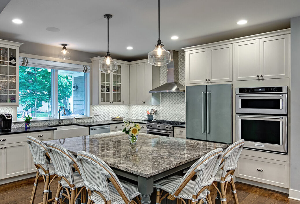Deemed as one of the more popular kitchen layouts due to its flexible shape that works well with any design style, whether a kitchen is modern or traditional, it provides very efficient properties, too. The benefit of this kitchen layout is that it not only provides the cook with an efficient work area, but it typically opens to a nearby room, making it easy for the cook to interact with guests. Depending on the overall size of your L-shaped kitchen design, a kitchen island can be added to expand storage and create additional countertop space as well. However, adding an island to the space does require more room to accommodate walkways around the island. The National Kitchen and Bath Association (NKBA) recommends that kitchen walkways should 36” wide minimum to allow for smooth traffic flow. A certified kitchen designer can help determine if you have enough space to accommodate an island in your kitchen.