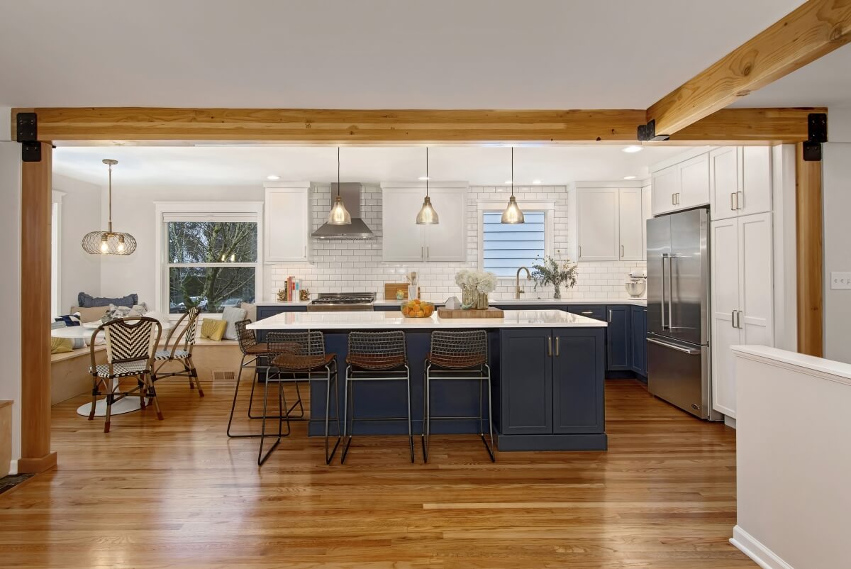As the name suggests, an L-Shaped kitchen layout is formed of two adjacent walls and runs of cabinetry, often referred to as the “legs” of the L. The length of the legs of the L can vary based on the available space of the area, and the shape itself is quite suitable for both large and small kitchens.