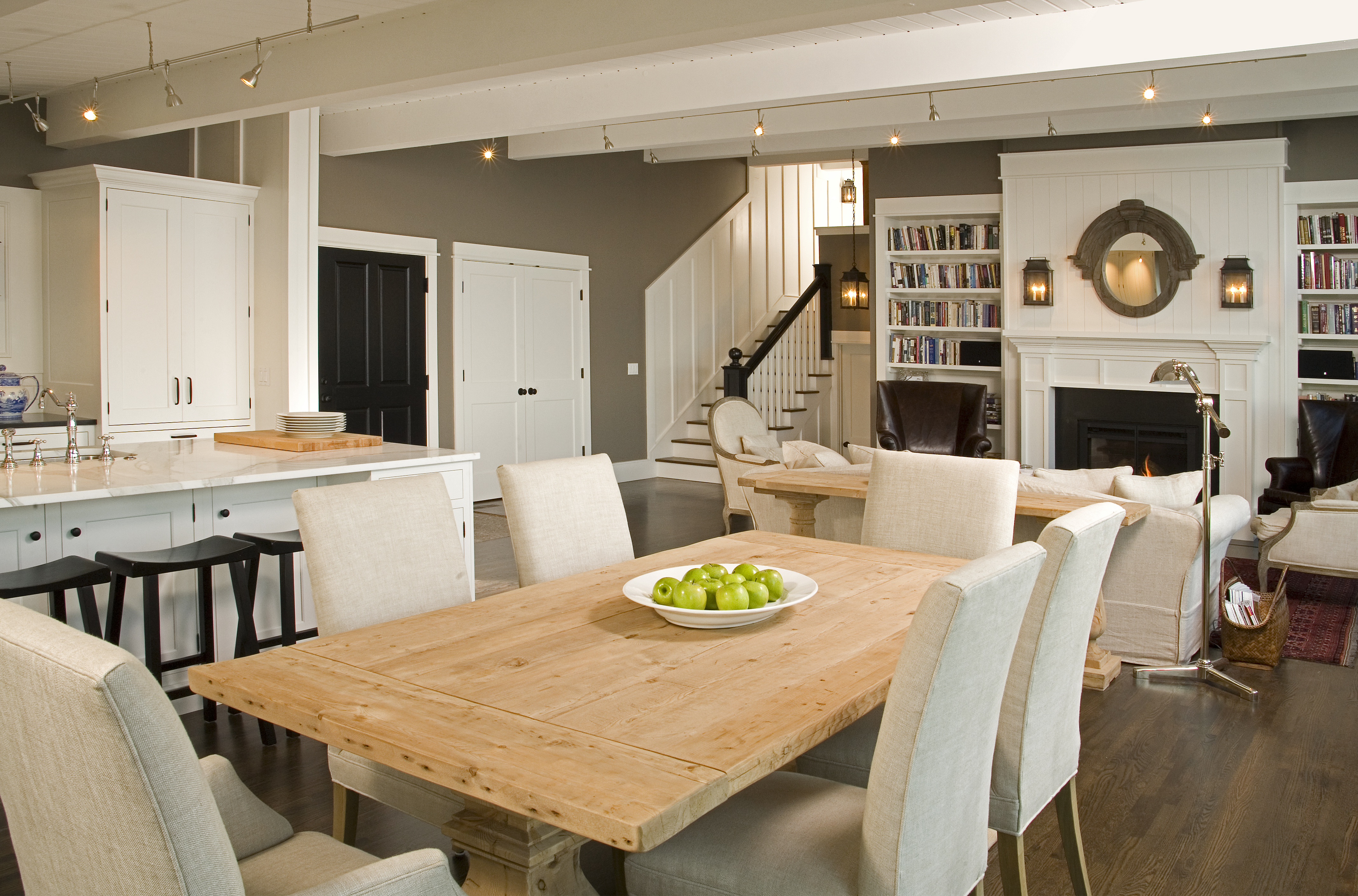Another visual tie-in and a unique design … instead of wall cabinets on either side of the hood, Greany kept the space more open and used wainscot panels with wall sconces to maximize task lighting. Coordinating sconces are used on the fireplace wall to create design consistency and a furniture-like look for the kitchen area. Small details like the location of the power outlets were considered so that the tile backsplash remains uninterrupted by unsightly outlets and yet they are located near the work surface for ease of use.