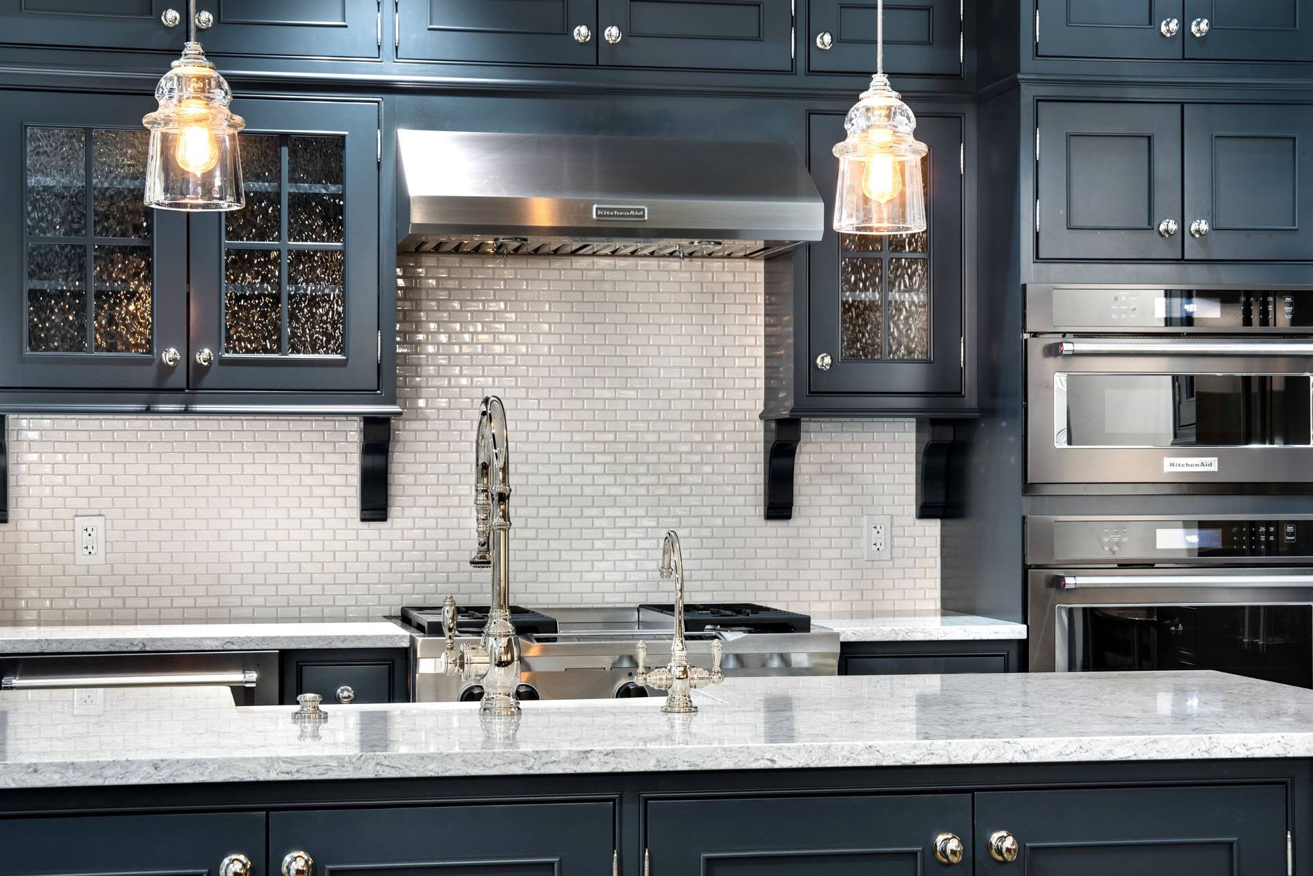 Another example of our Decorative End Bracket in style B flanking the apothecary drawers to create a furniture look. You can also see our transitional corbel “A” used on our mantle hood beside it.