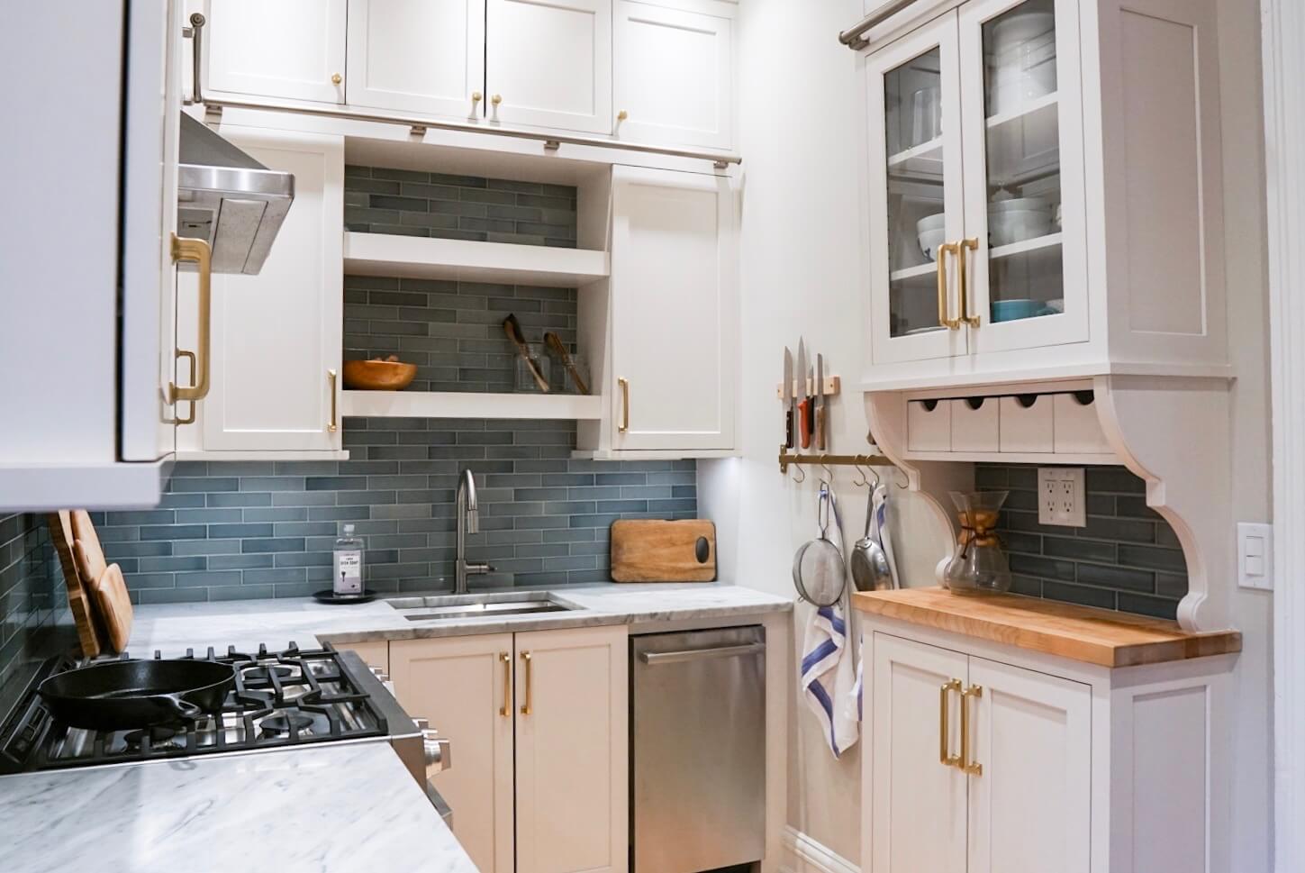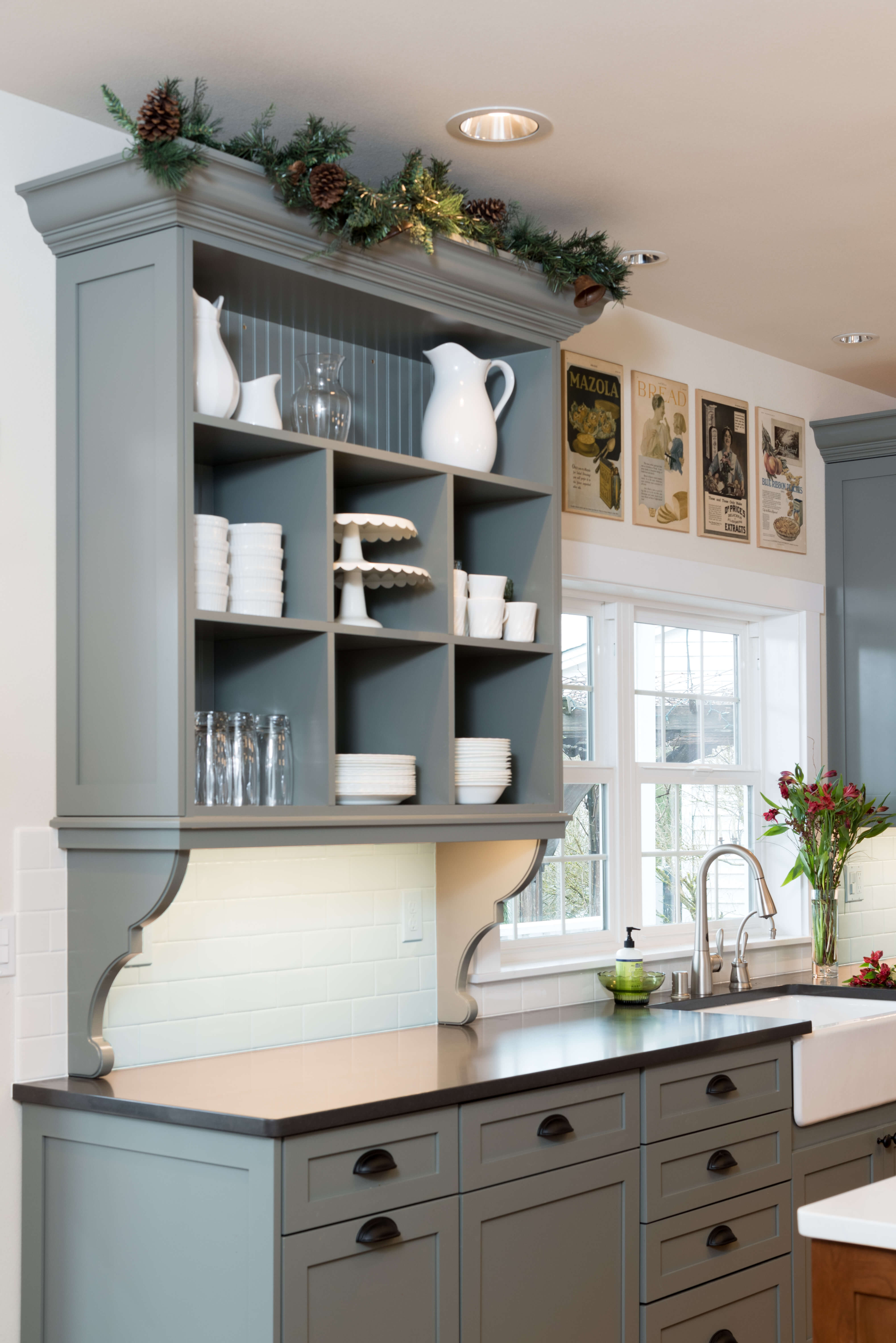 A stylish hutch area for this kitchen was created with open shelves and adding the B style Decorative End Bracket.