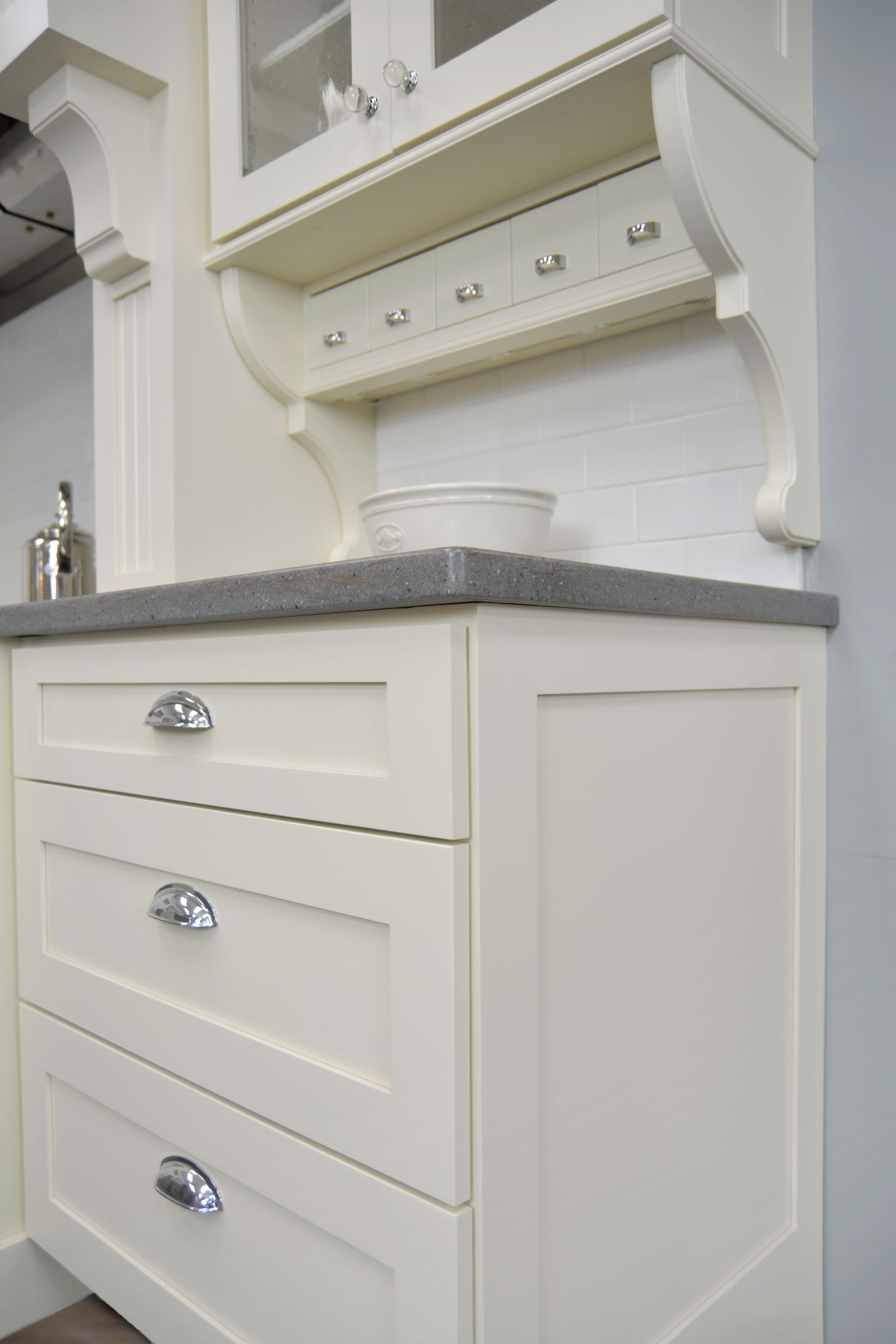 This raised kitchen island top is dressed up with our Transitional Corbel style A