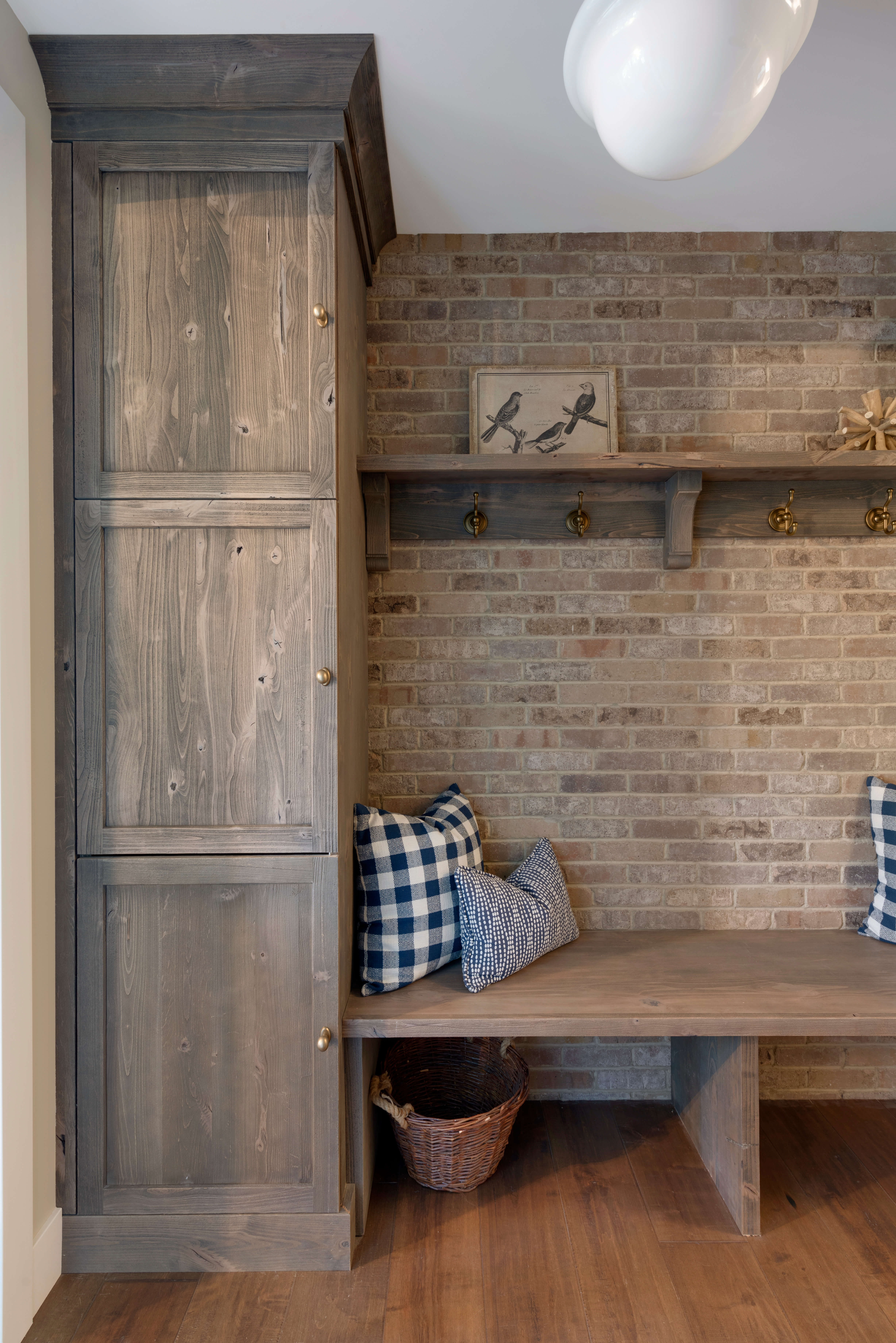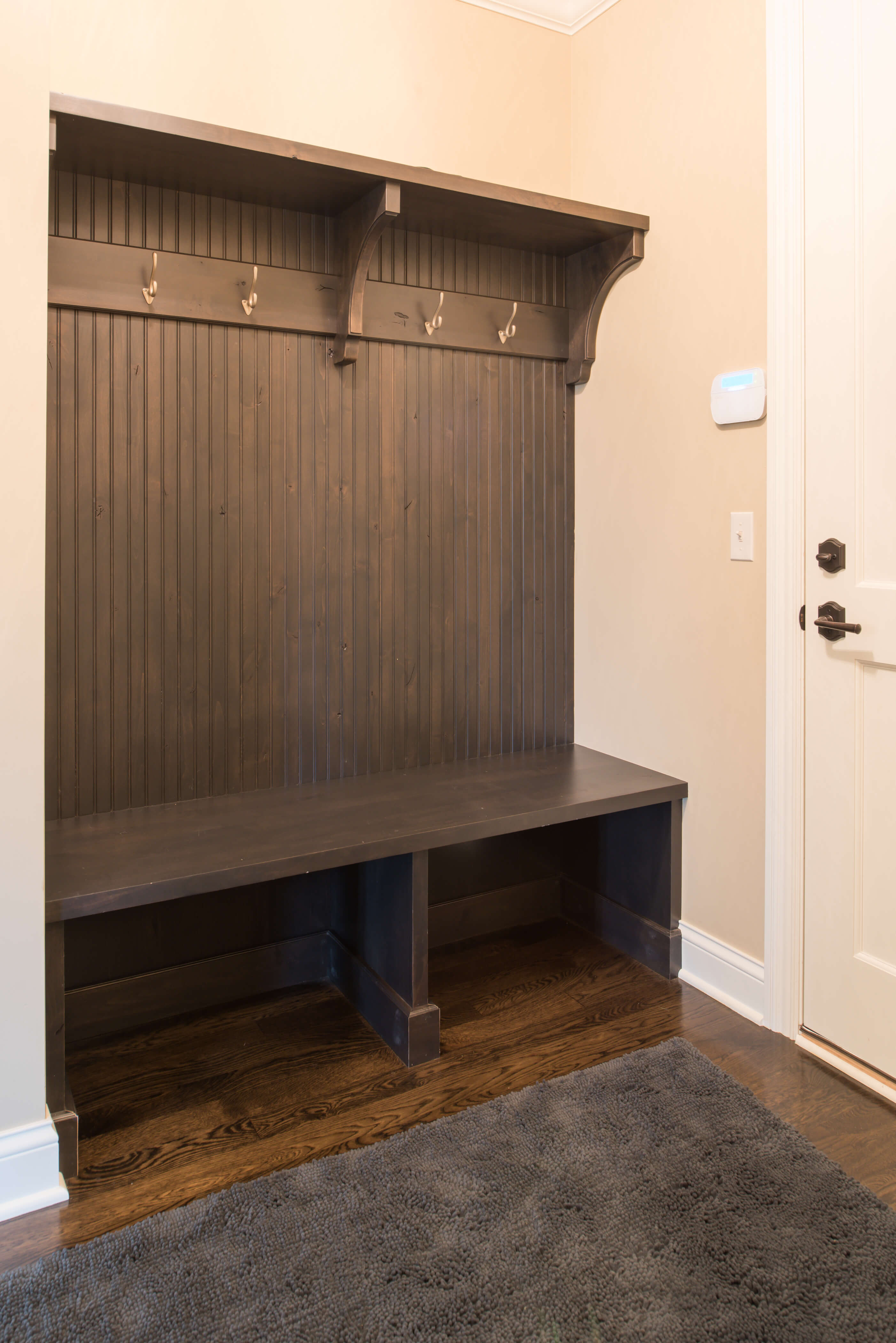 Our Decorative Bracket style A is used as a decorative support for the furniture shelf above in this mudroom.