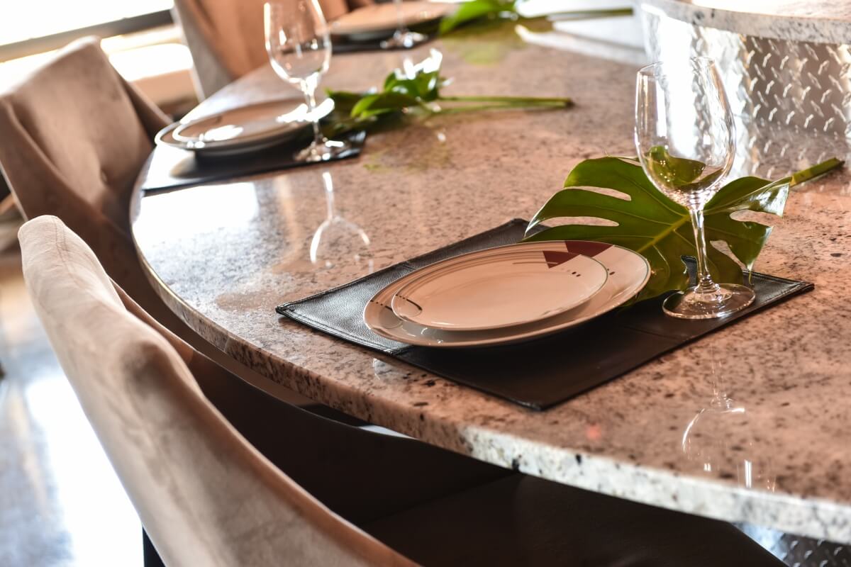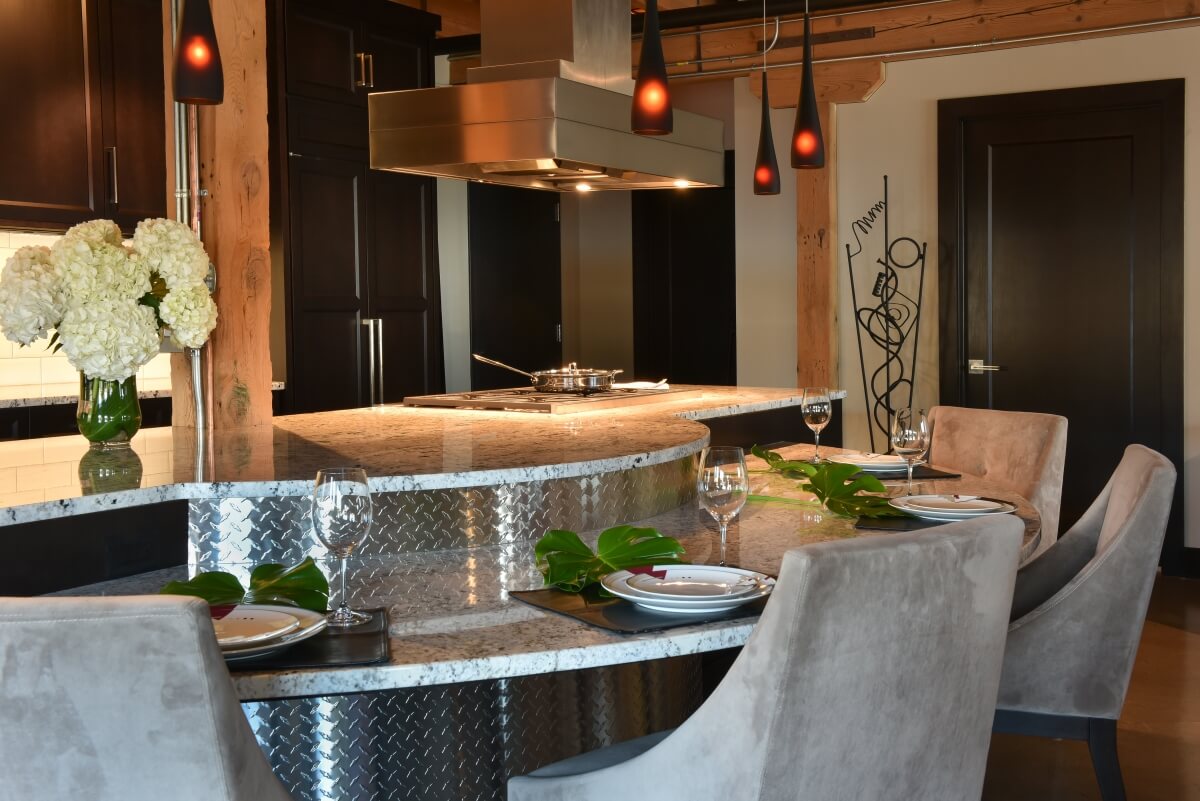 Because of the unique, architecture of the converted warehouse, Meyers carefully planned the kitchen design to work fluidly with the existing structural elements, beams and rooftop access for venting. The couple also wanted specific areas in the kitchen for cooking and food prep, dining and computer work – a true multi-tasking space.