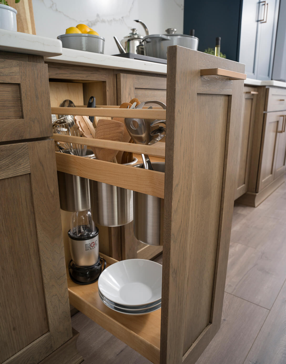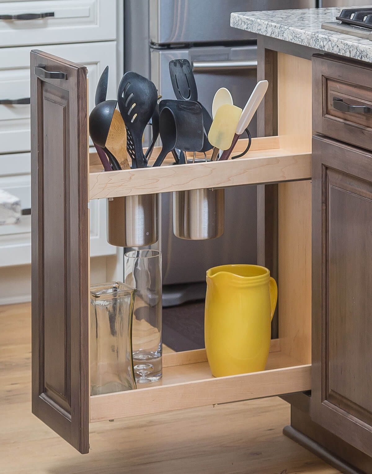 Dura Supreme’s Base Utensil Pull-Out keeps frequently used utensils close at hand. The shelf below provides additional storage space for pantry items, small appliances, and more.