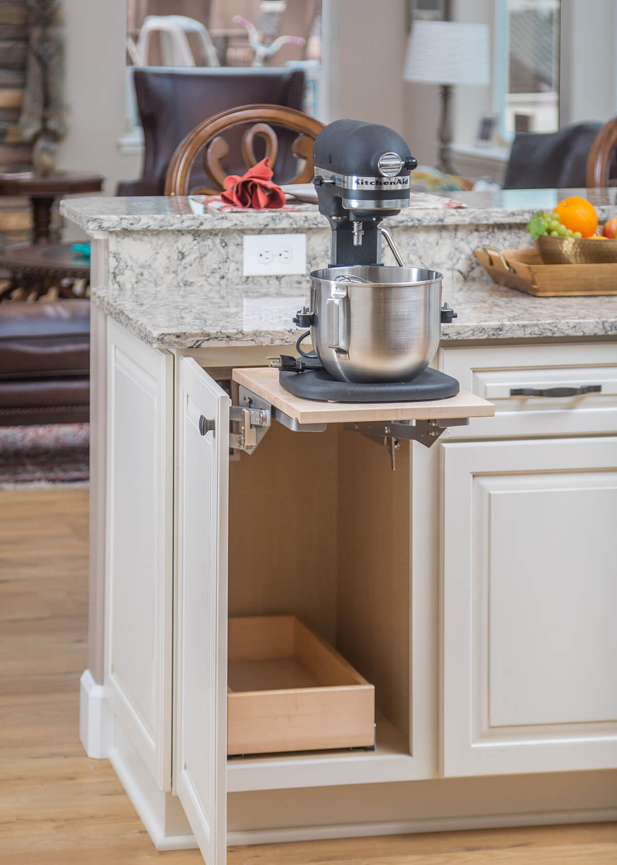 Of course, there is the ever-popular swing-up mixer stand. Designed to save the baker’s back from having to pull out the mixer from a lower cabinet for use. A unique feature of Dura Supreme’s swing-up mixer cabinet is that it standardly includes a roll-out tray at the bottom, a convenient place to store rolling pins, flour, sugar, and cookie cutters.