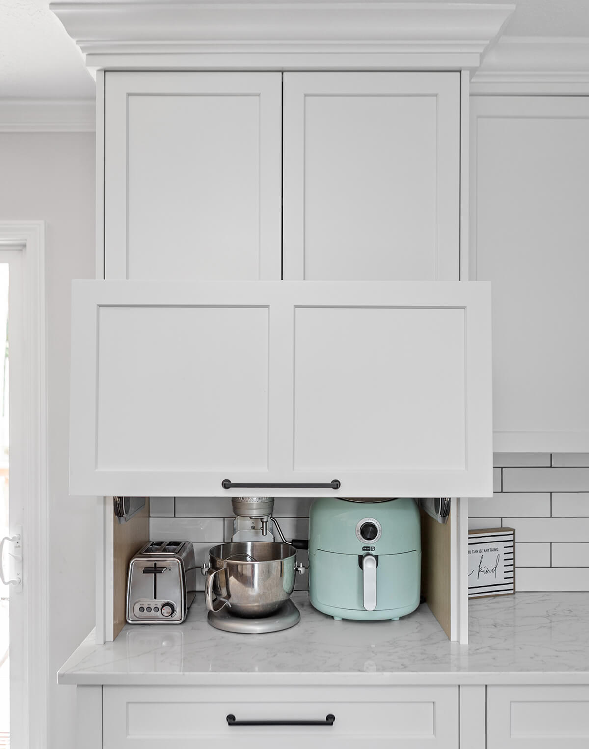 Another great plan designed to house baking appliances incorporates a wall cabinet brought to the countertop. Below are a couple of examples of this- using a horizontal bifold door, and another using a lift door. The bifold and lift doors are great in this instance because they avoid countertop space when operating. Dura Supreme also offers the option to omit the bottom of the cabinet, allowing the countertop to serve as the bottom surface.