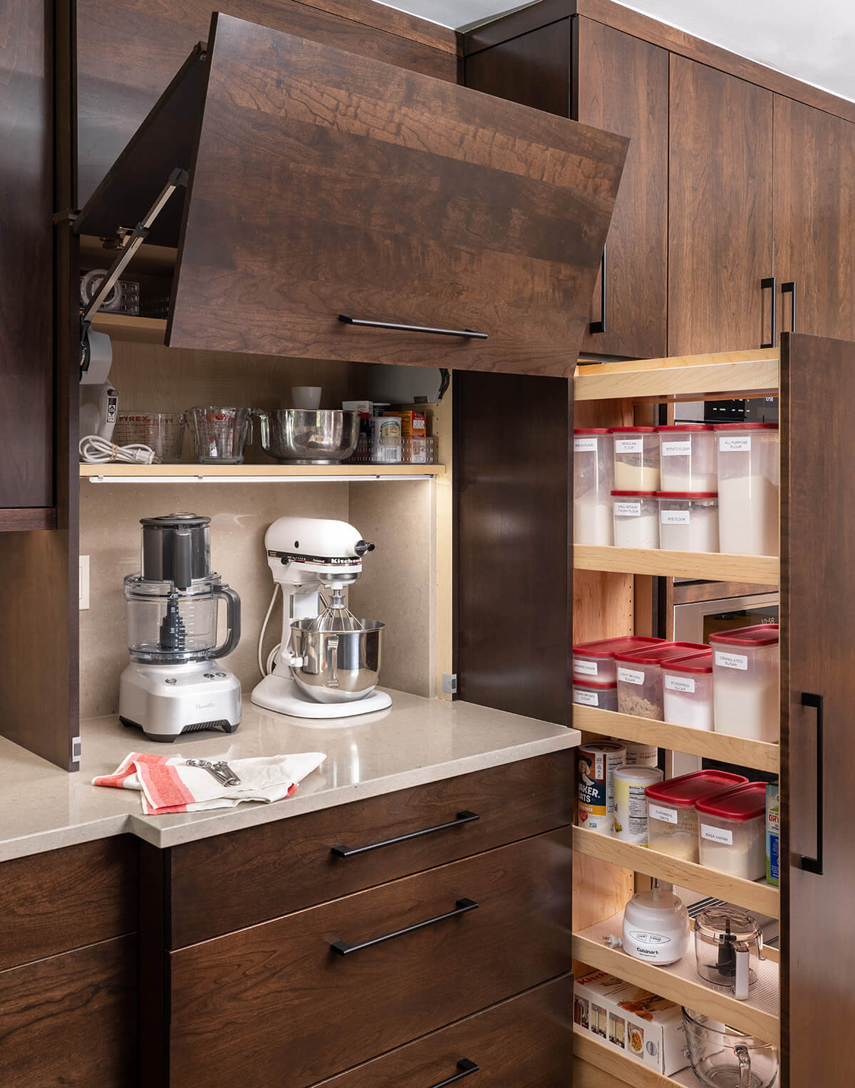Base height and taller pull-out accessories are the workhorses of pantry storage, housing flour, sugar, vanilla, nutmeg, and so much more.