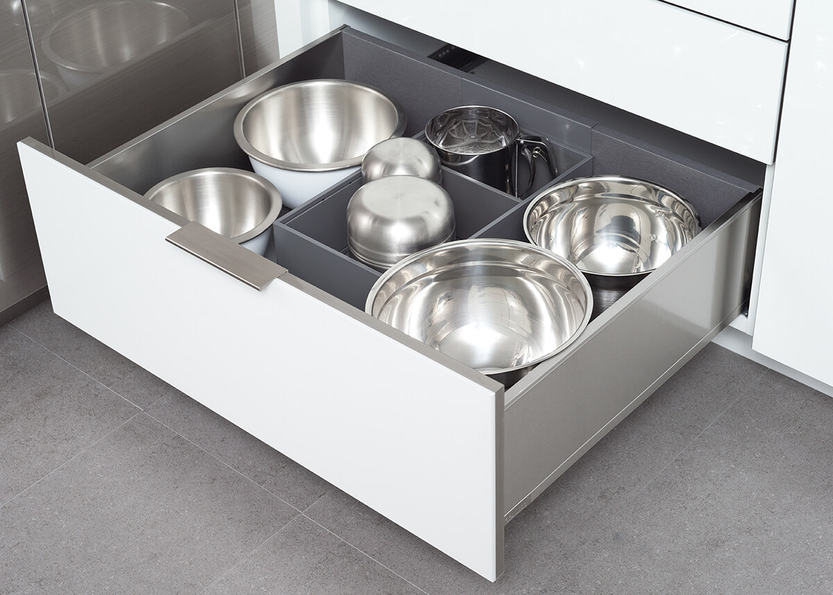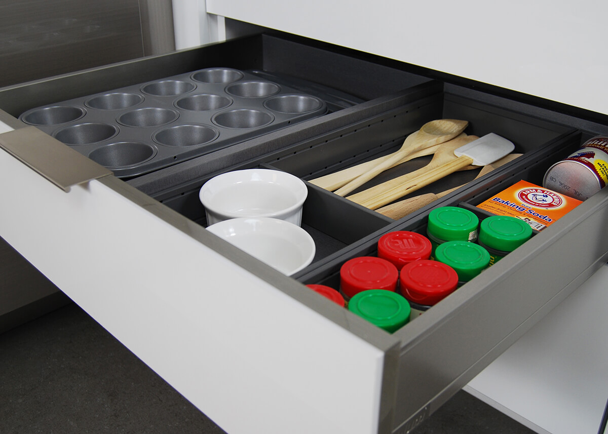Adjustable or fixed partitions can also be added to any drawer box or roll-out to organize further mixing bowls, muffin pans, and baking pantry items.