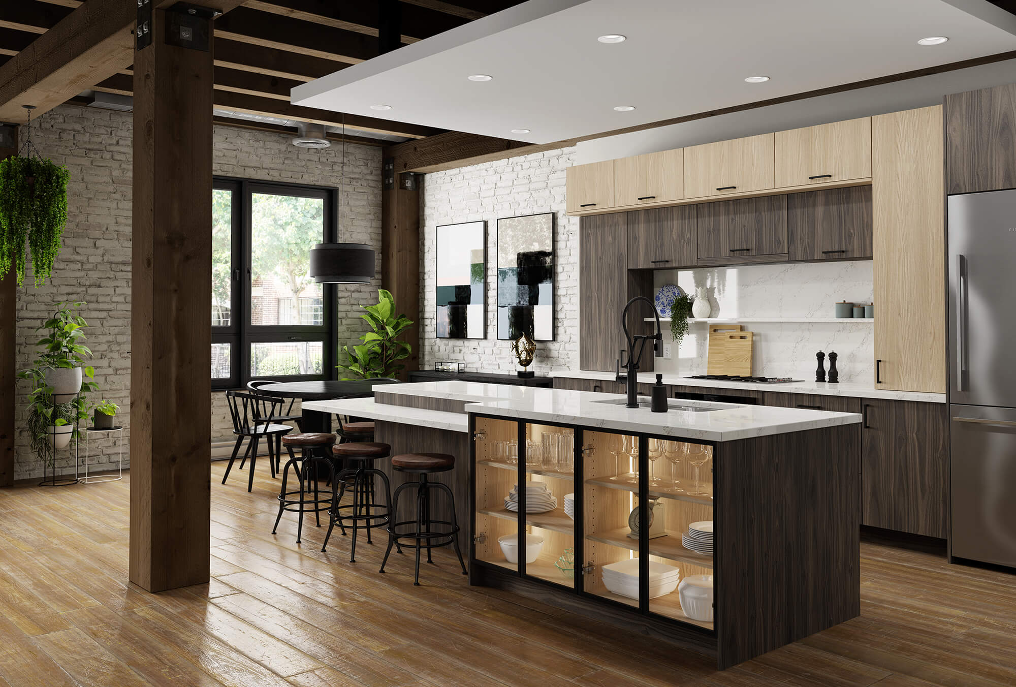 This industrial styled kitchen features the Aiden – Vertical slab door style in a combination of the “Verona” and “Salerno” Sculpted TFL.