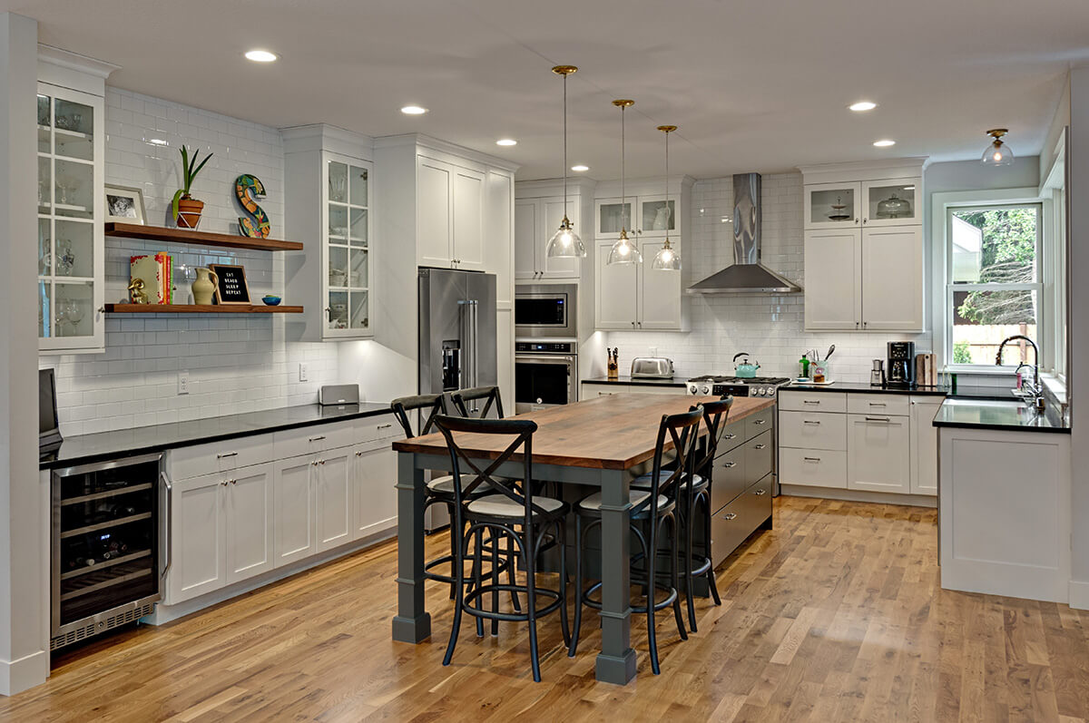 Their desired home design was a contemporary farmhouse with an open concept layout to fit their love of entertaining. Among many of the details, we incorporated custom Douglas fir beams to warm the beautiful white, airy space that spanned from the kitchen, dining space to the great room.