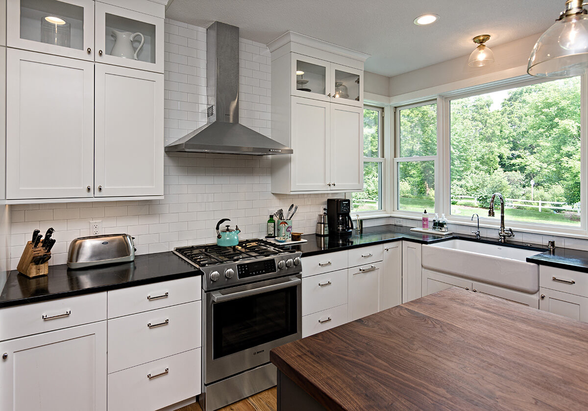 The kitchen design is built around the stunning backyard views, centering the kitchen sink on the view and making sure the view is easy to take in while standing at the range.