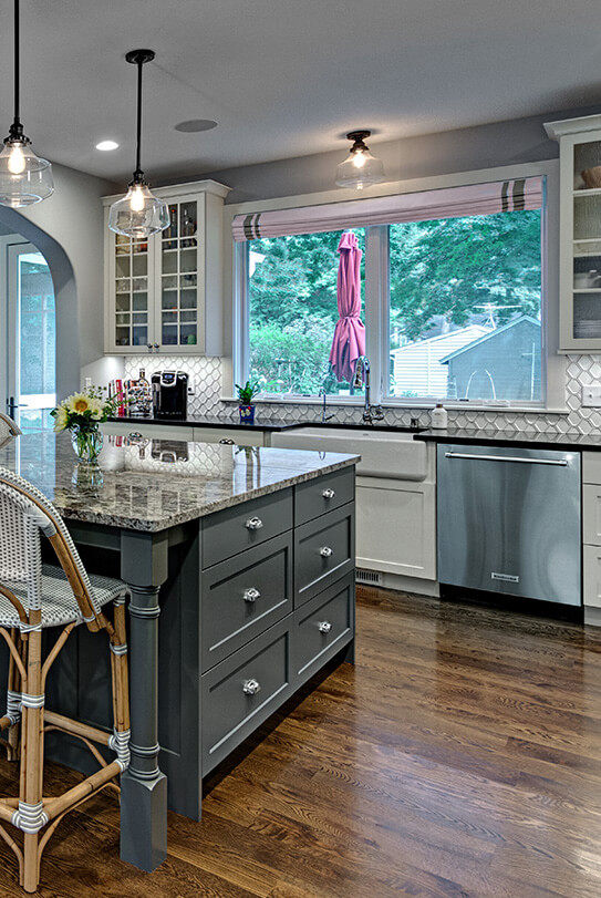 With some similar tastes as their friends, we incorporated Dura Supreme’s Hudson shaker door style in  “Strom Gray” paint on a furniture styled kitchen island (inspired by their friend’s kitchen island). The perimeter of the kitchen uses the same door style, but takes on more of a modern cottage look with mullion glass cabinet doors and a “Pearl” painted finish to contrast the island.