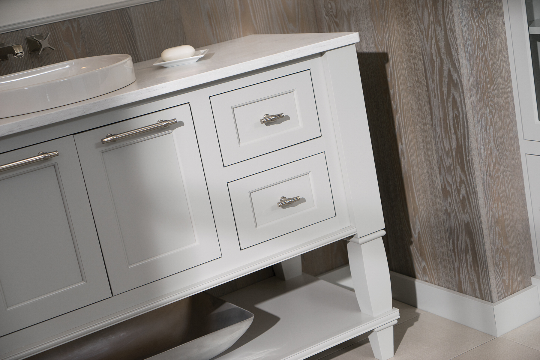 Oak panels with Weathered “A” treatment applied adds a soft texture to this bathroom with our Furniture Family 5 Vanity with Kendall Panel inset door in Silver Mist paint.