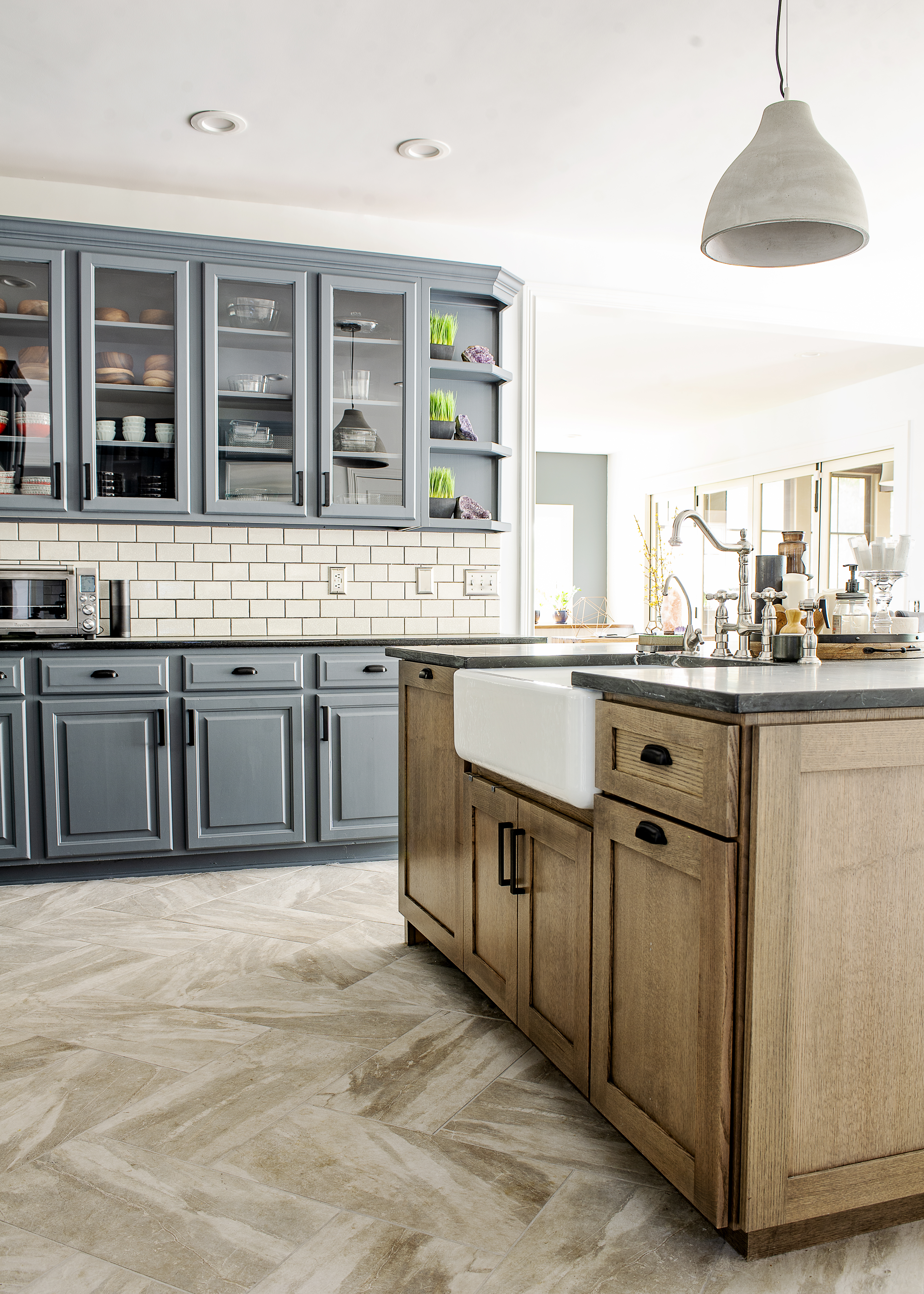 This kitchen (installed by our friends at Emergent Construction in Indianapolis, IN) combines both painted and stained cabinets. The island is our Craftsman door style in Toast stained QSWO, and the brown and gray tones add warmth and texture to the cool blue tones of the painted perimeter cabinetry.