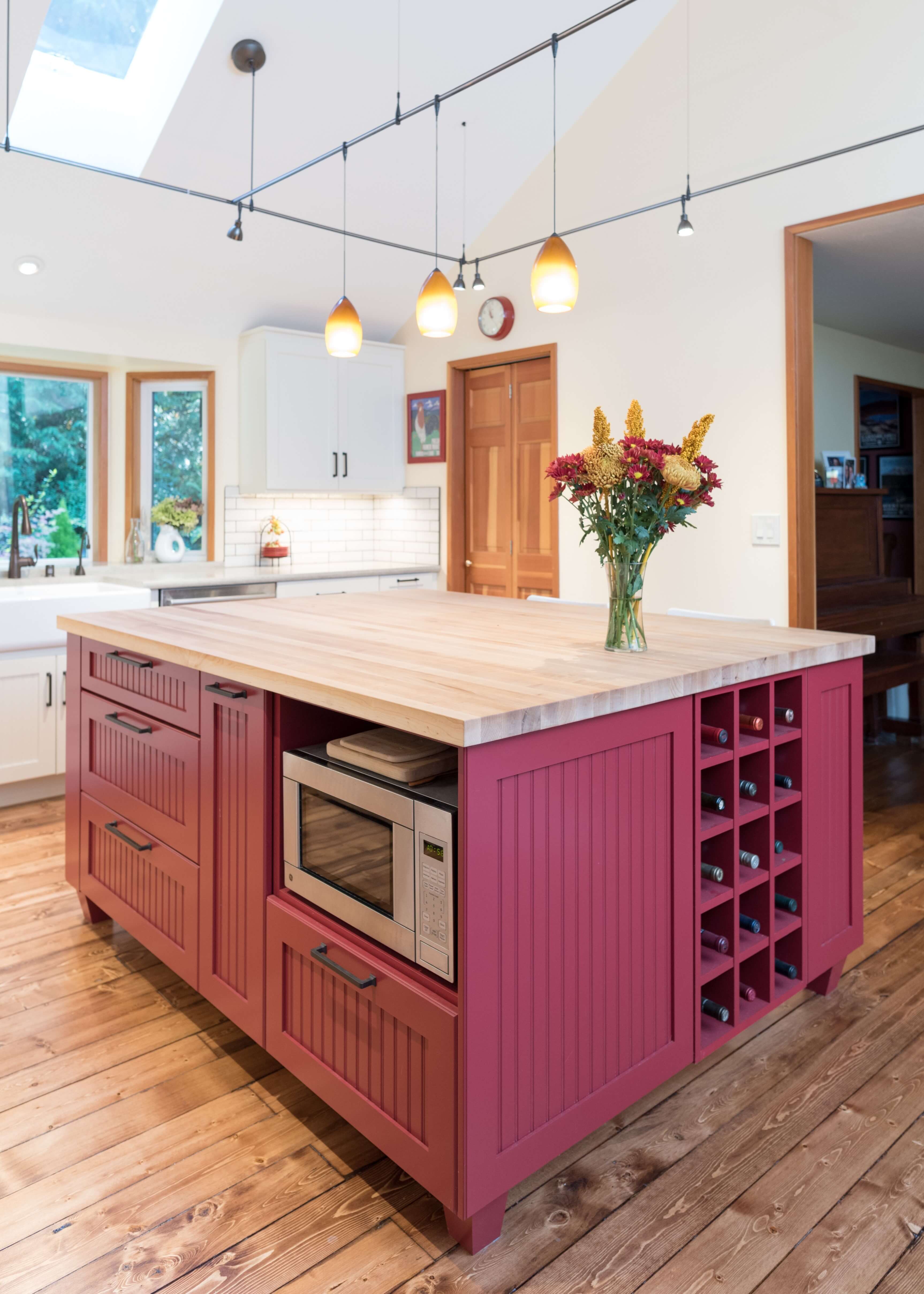 This kitchen uses a spicy splash of Benjamin Moore Chili Pepper (BM2004-20) red paint on the kitchen island to contrast the surrounding White painted cabinets.