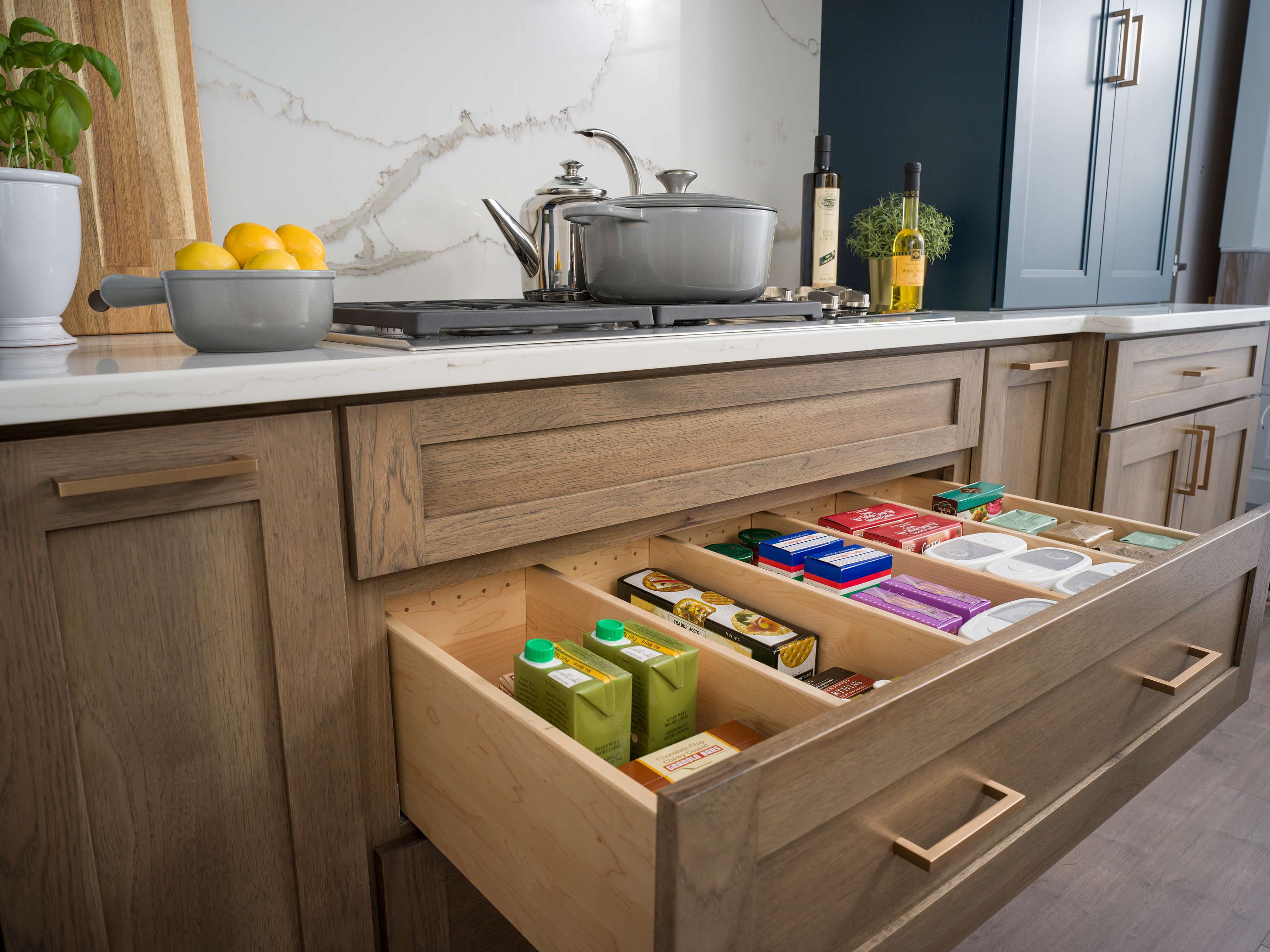 Of course, no work zone would be complete without adequate storage for commonly used items, such as cutting boards, knives, utensils, mixing bowls, ingredients, spices, aprons, towels, and cleaning essentials. Below are a few examples of how you can create a functional and organized Prep Zone with kitchen storage solutions from Dura Supreme.