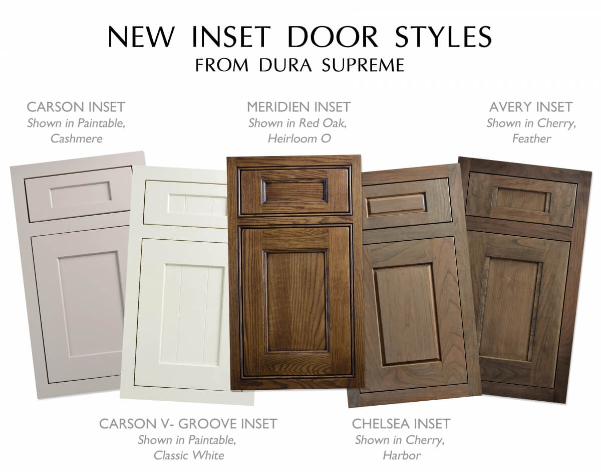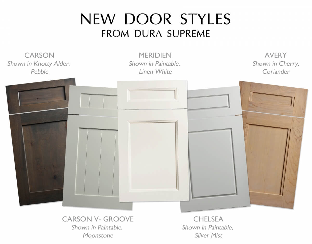 Howard Lake, MN:  Dura Supreme Cabinetry recently announced new full-overlay and inset cabinet door styles that extend their already expansive door style selection. The new additions include Carson, Carson V-Groove, Chelsea, Meridien, and Avery. These versatile, new styles can be designed with both transitional and traditional styled interiors.