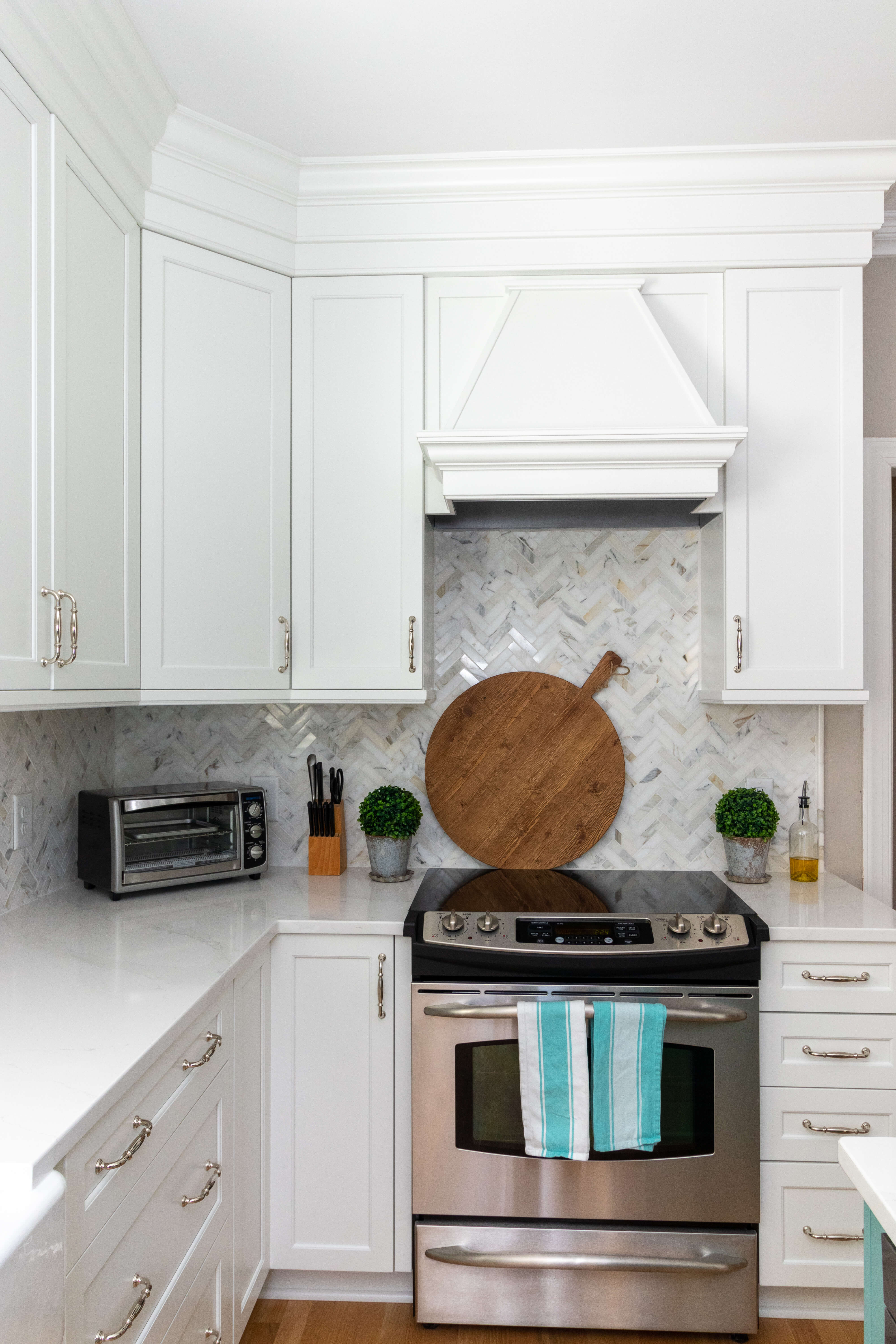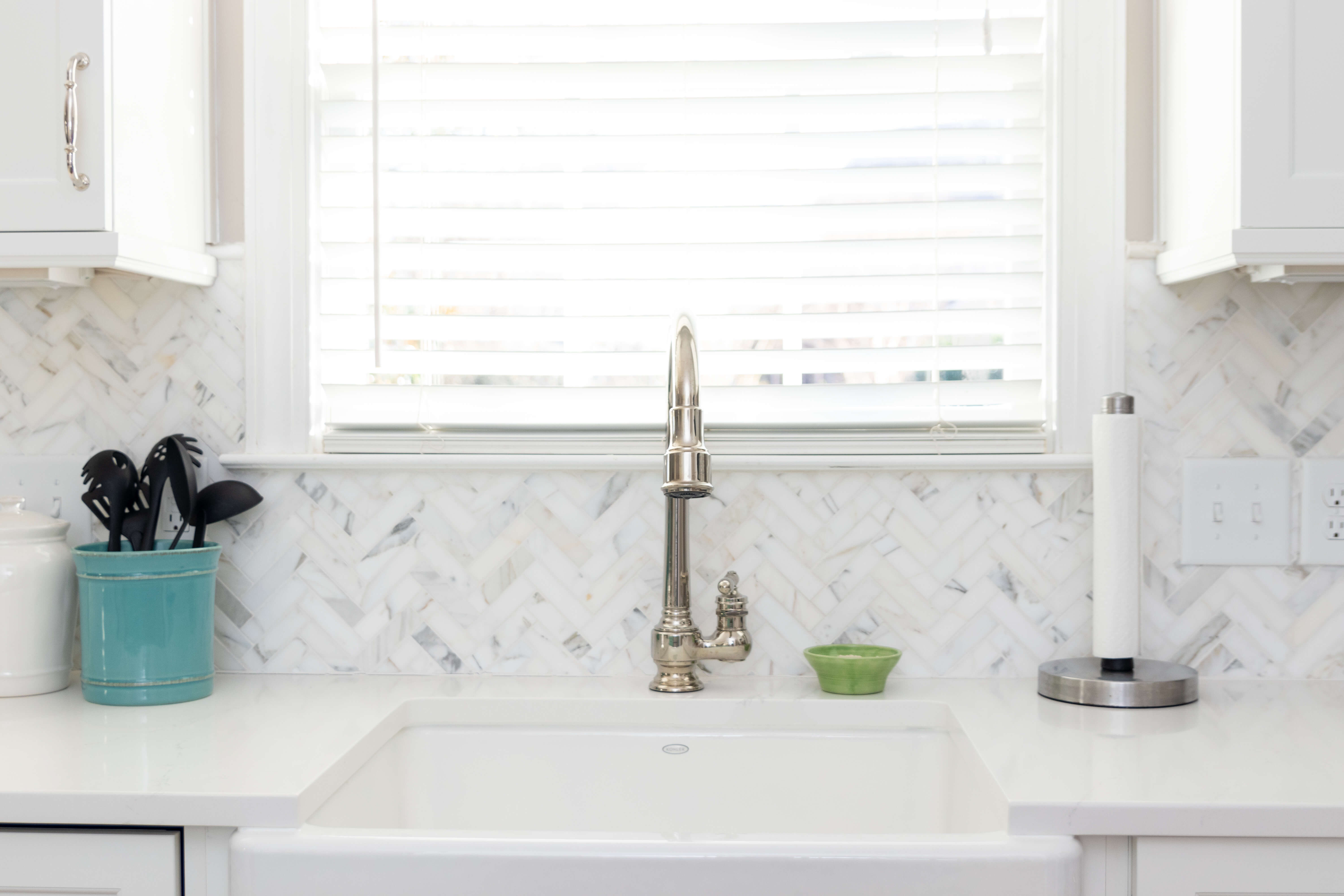 To add some texture to the look, Michelle suggested a herringbone-patterned backsplash tile. Personally, I love how this detail tile adds a flare of personality, yet doesn’t overwhelm the space.