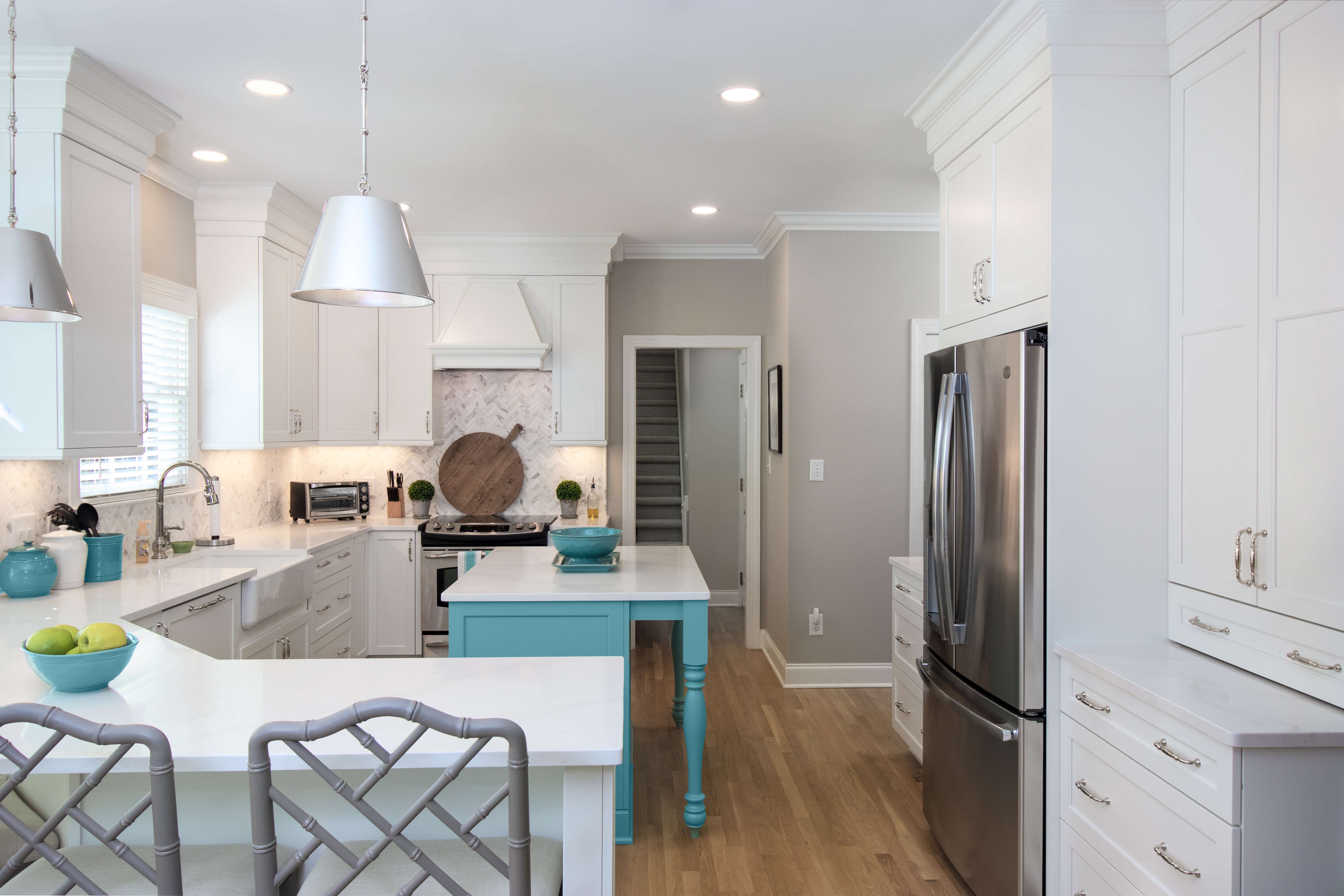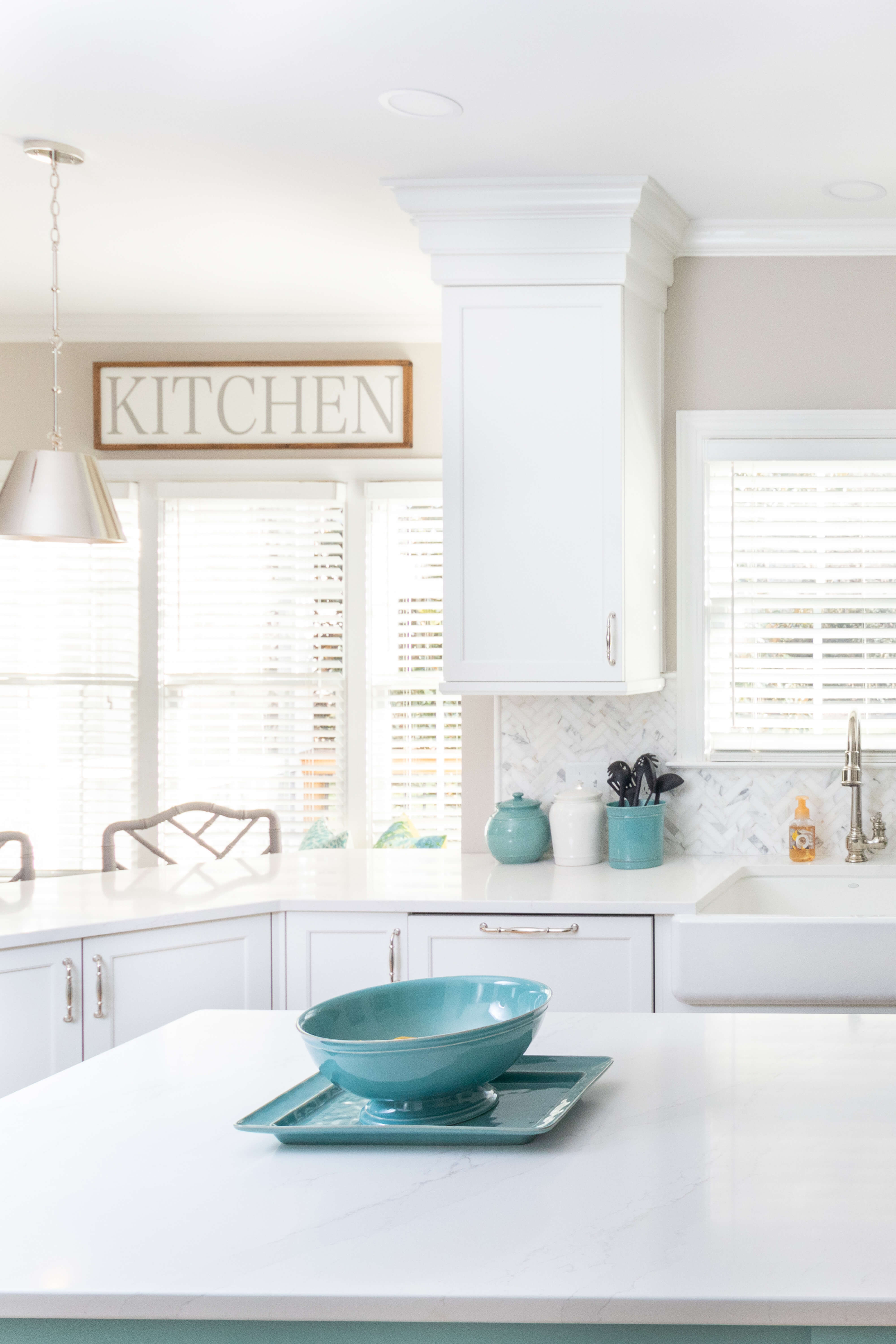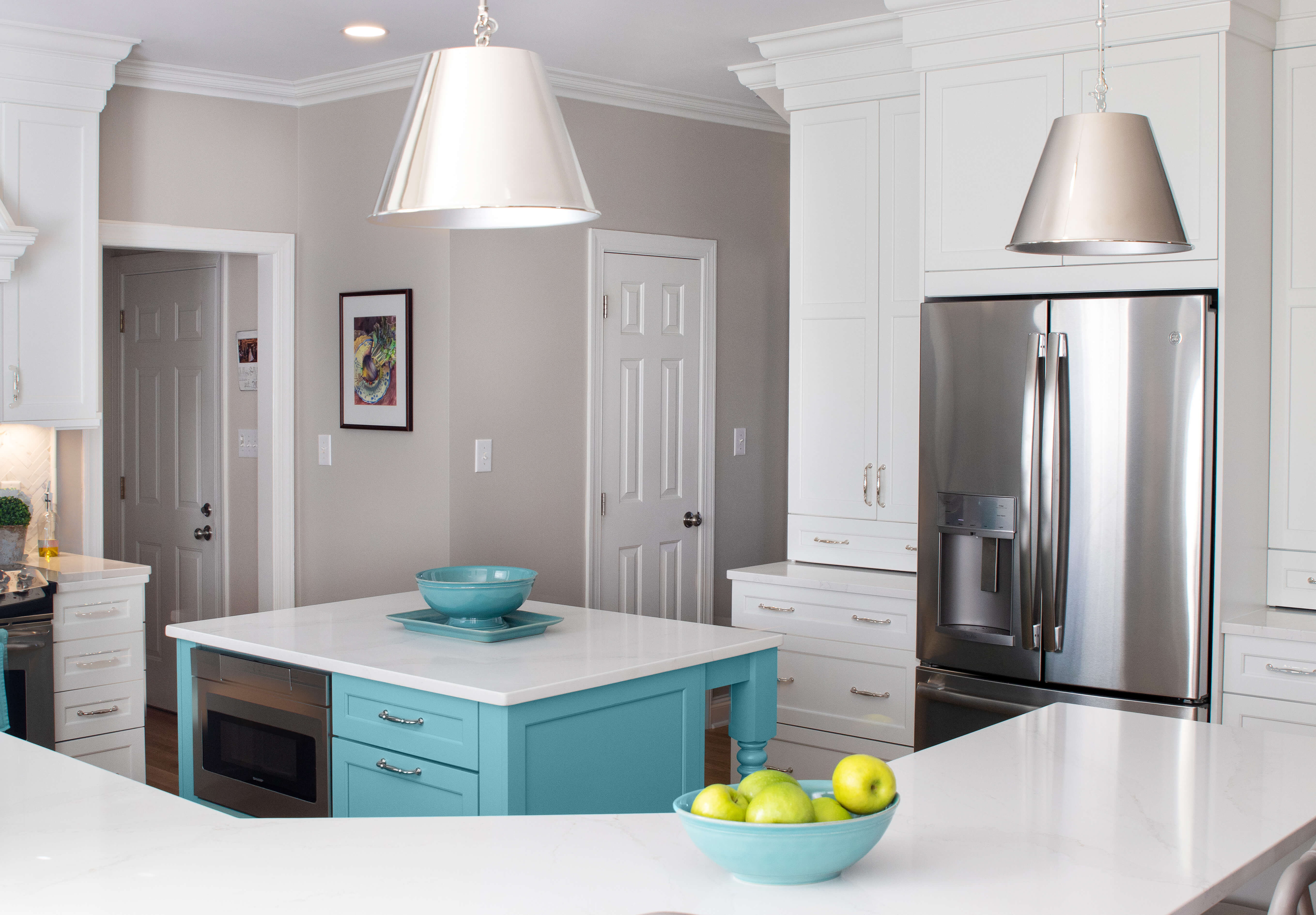 The couple was seeking an elegant and coastal-inspired kitchen with a burst of their style and personality. They already owned a collection of beautifully bright ocean blue mixing bowls and cooking décor. Michelle found a very similar paint color to match called “Lakeshore” by Sherwin-Williams. After a quick meeting, and some initial thoughts, this color became the primary inspiration for the design.