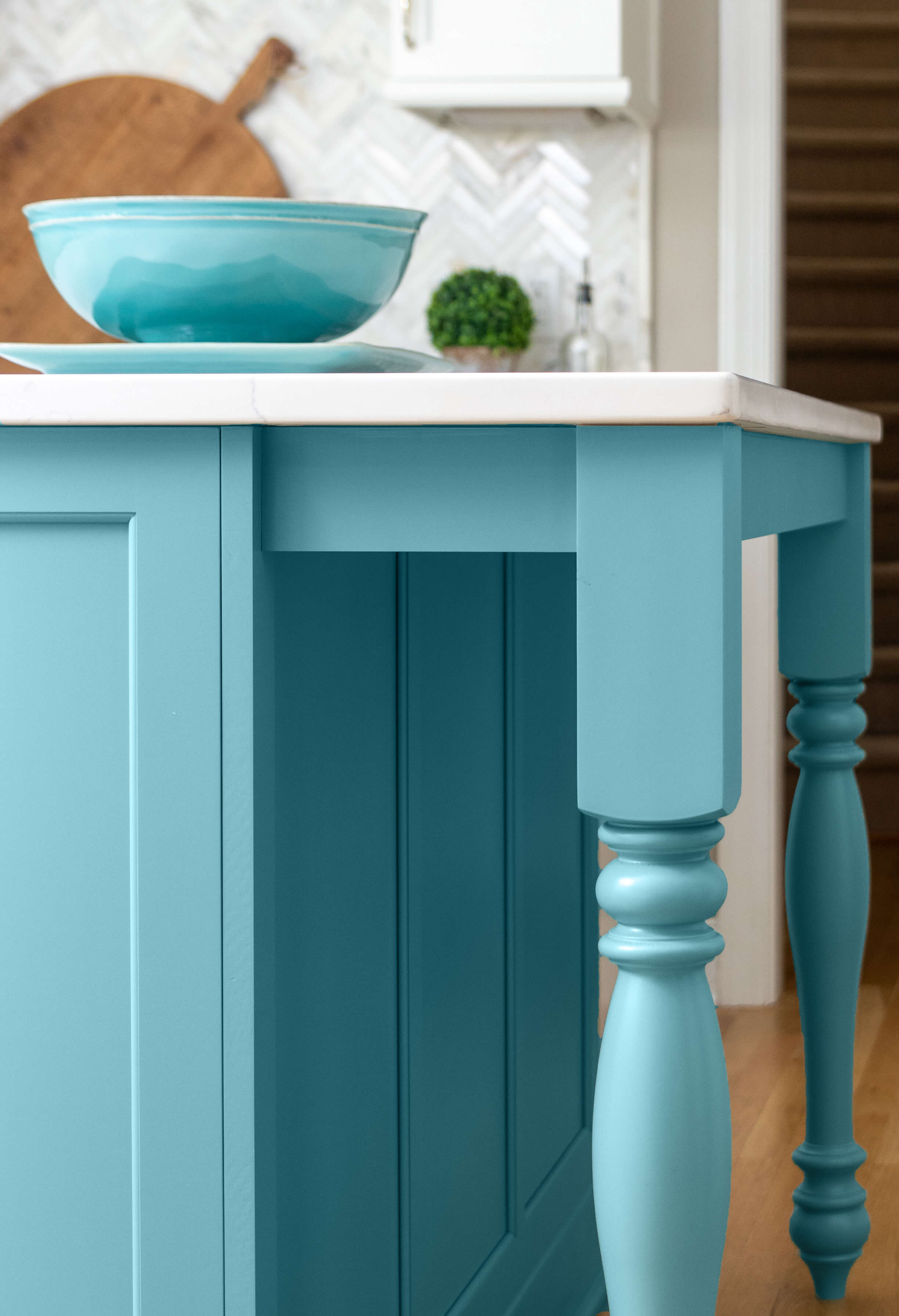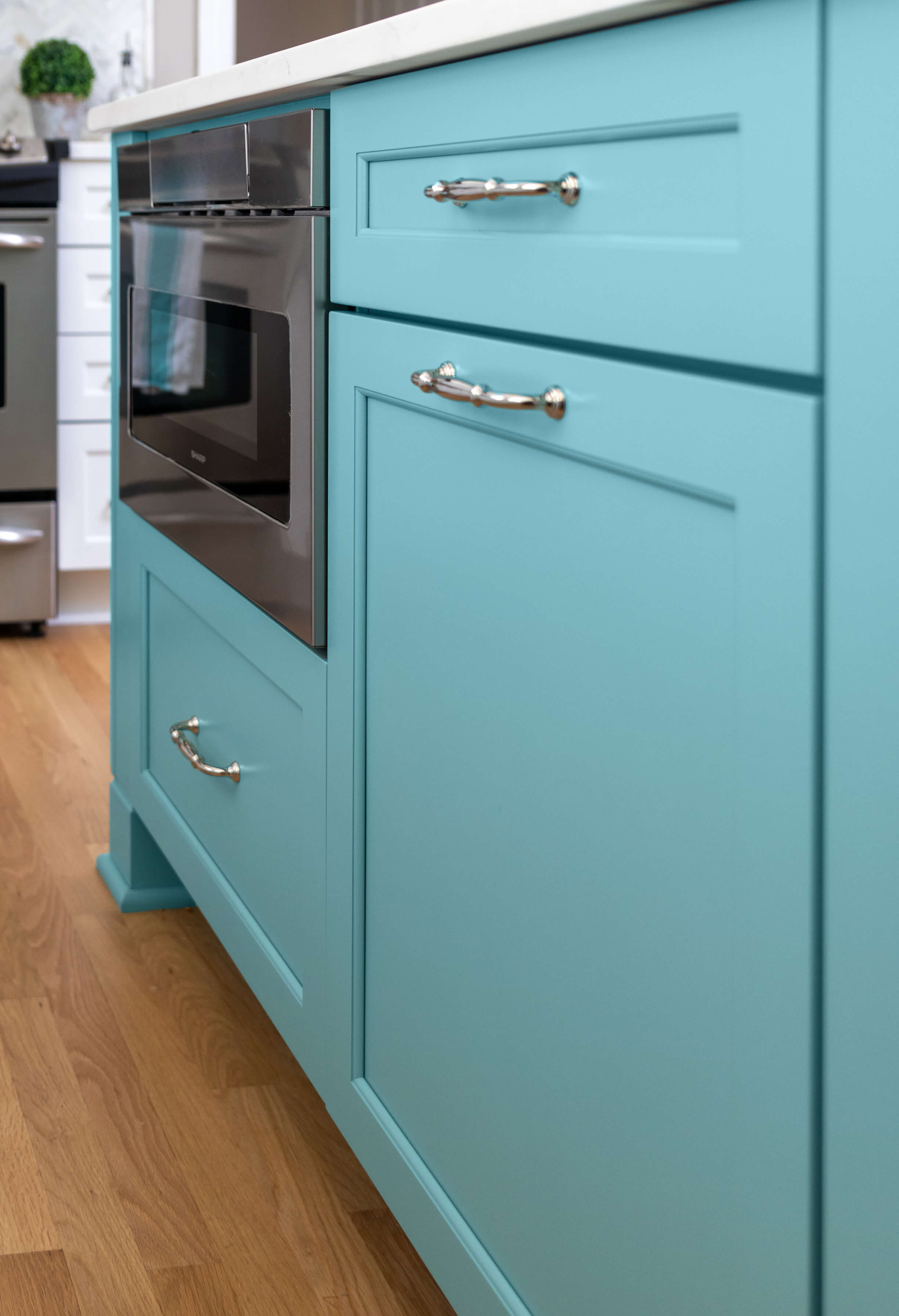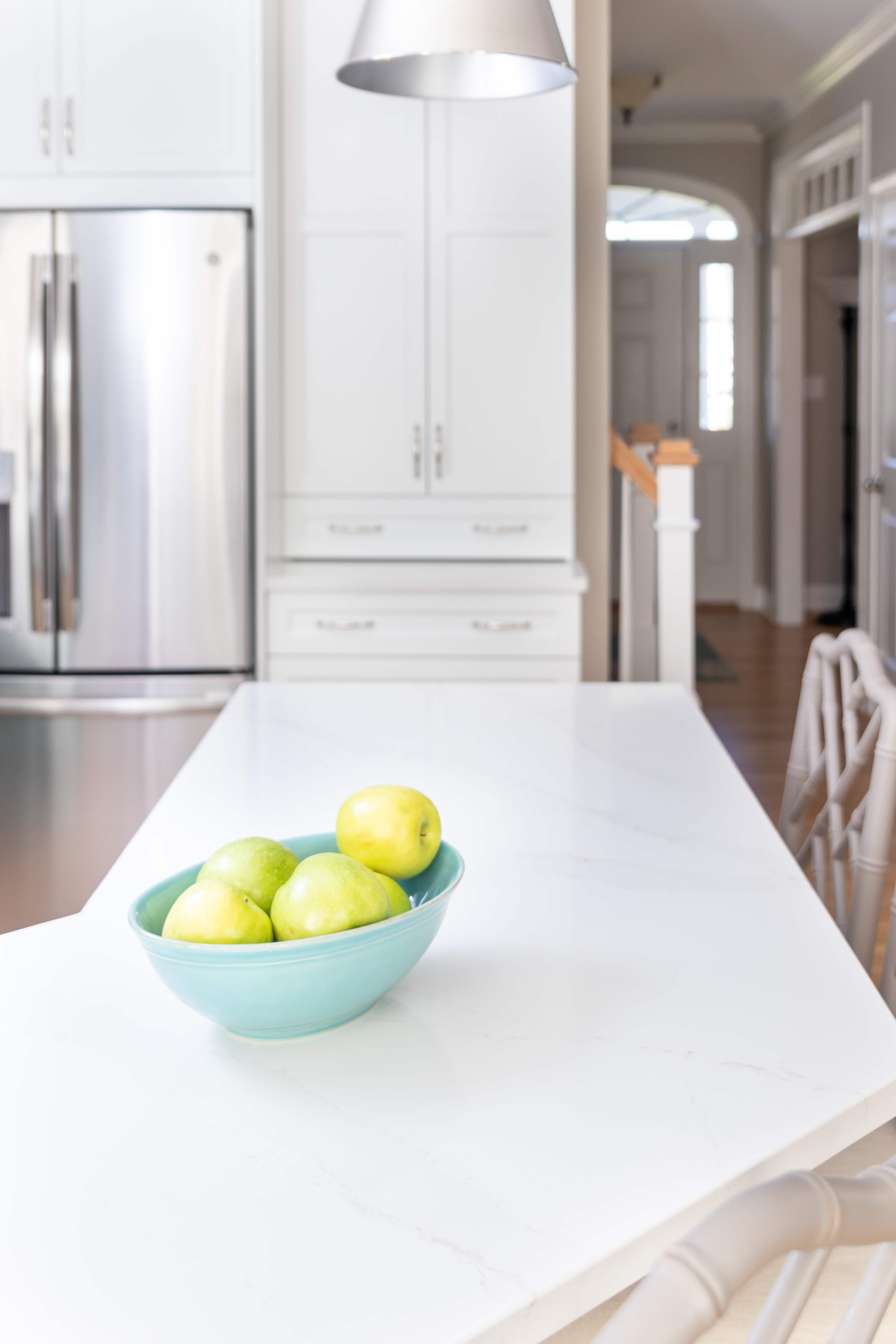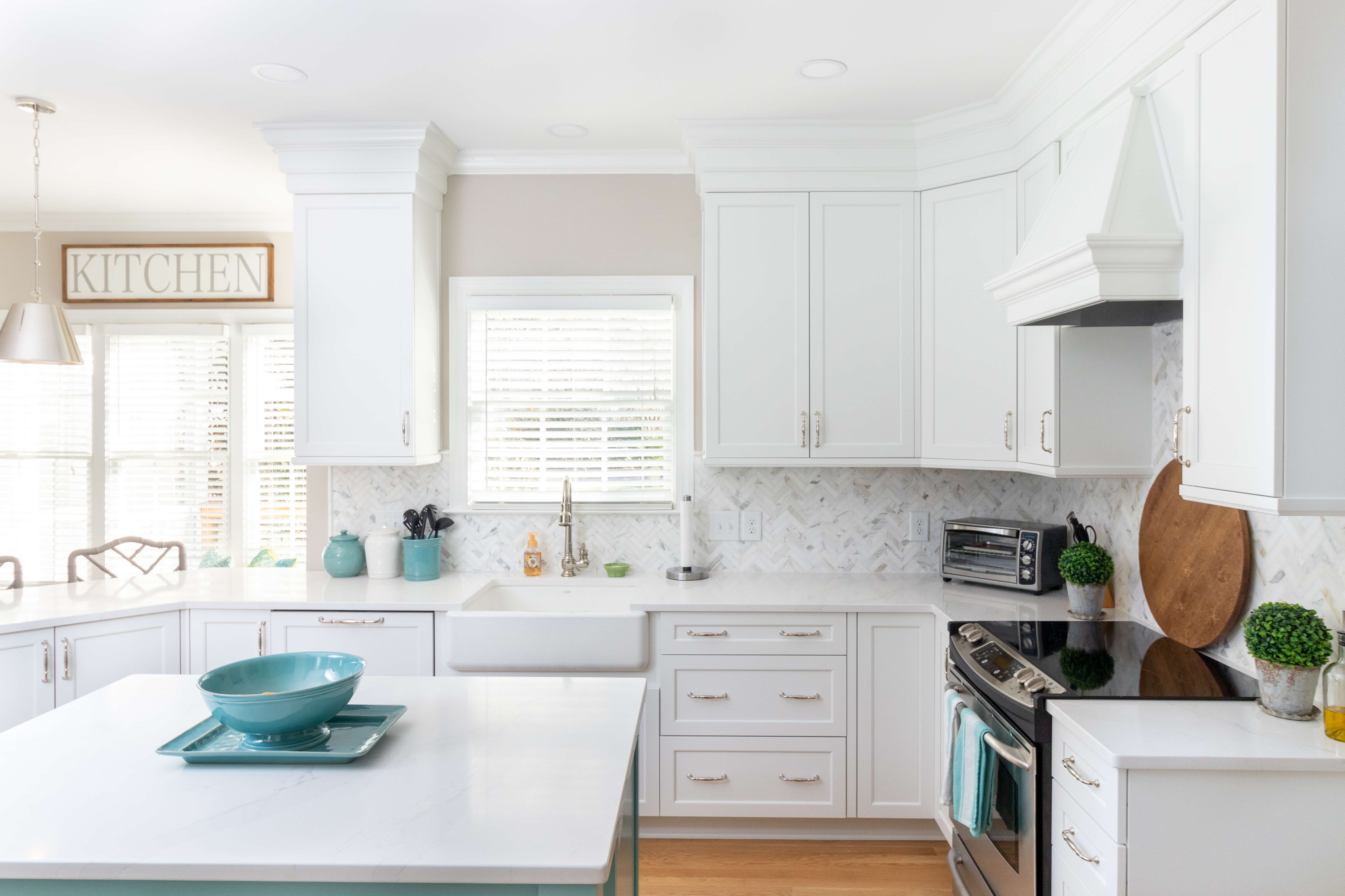 The couple was seeking an elegant and coastal-inspired kitchen with a burst of their style and personality. They already owned a collection of beautifully bright ocean blue mixing bowls and cooking décor. Michelle found a very similar paint color to match called “Lakeshore” by Sherwin-Williams. After a quick meeting, and some initial thoughts, this color became the primary inspiration for the design.