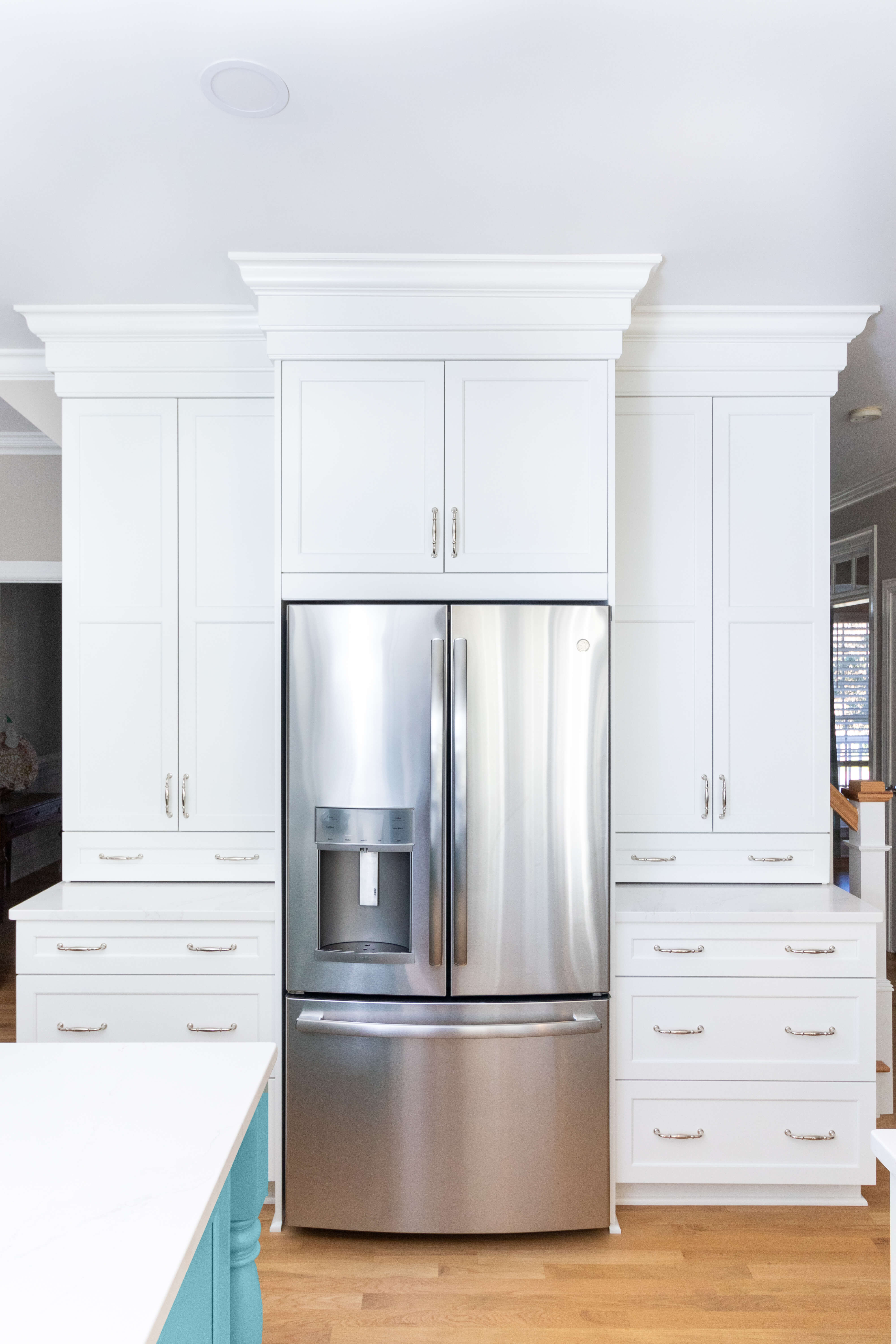 With the Dura Supremes Personal Paint Match program, they were able to add a splash of the “Lakeshore” blue to the kitchen island creating a stunning feature in the center of the design.