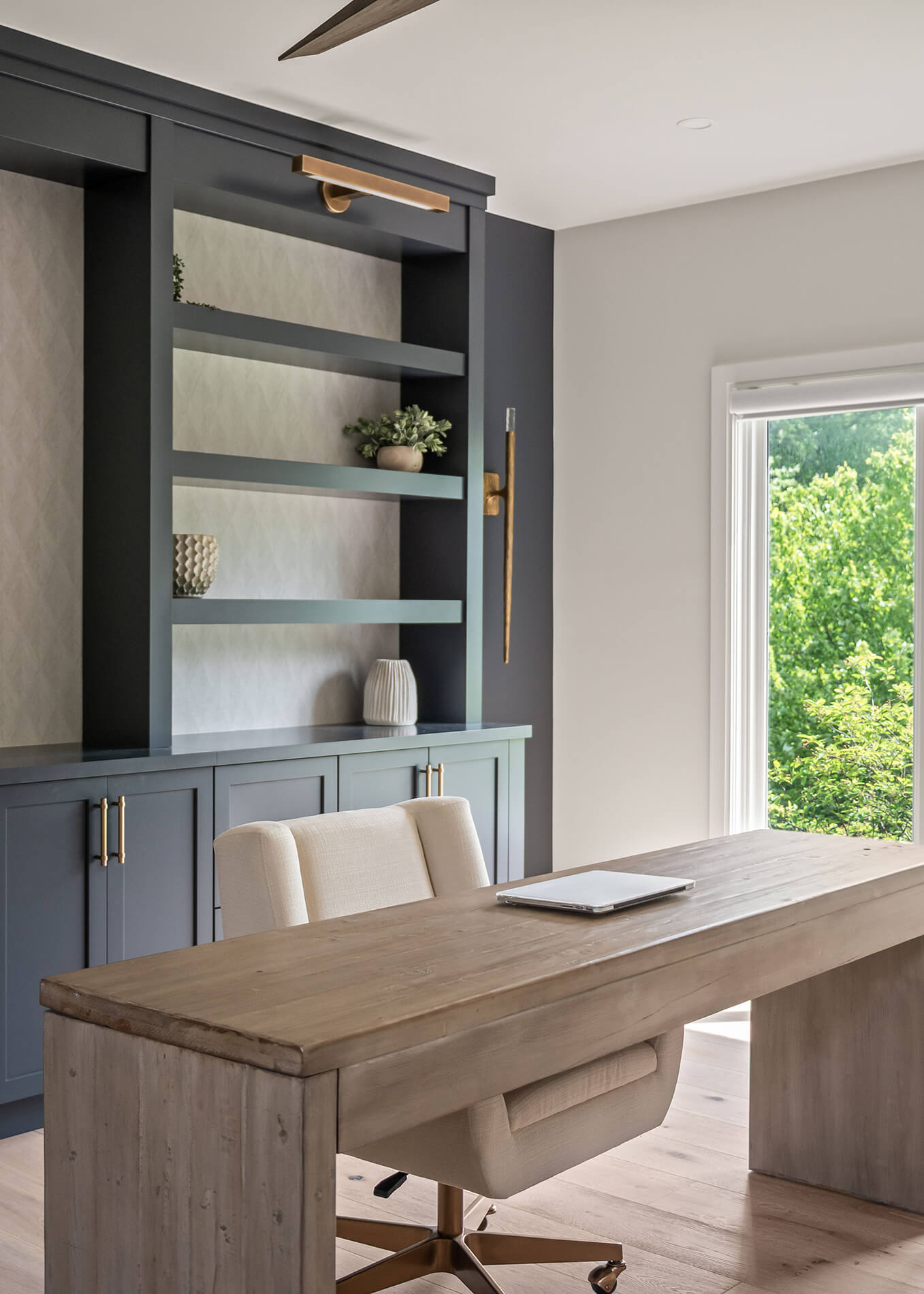 In the home office, we took a bolder approach – cabinetry using the Hudson door style in “Cyberspace” paint finish, bringing focus and sophistication to the space where work happens. It feels grounded, personal, and strong.