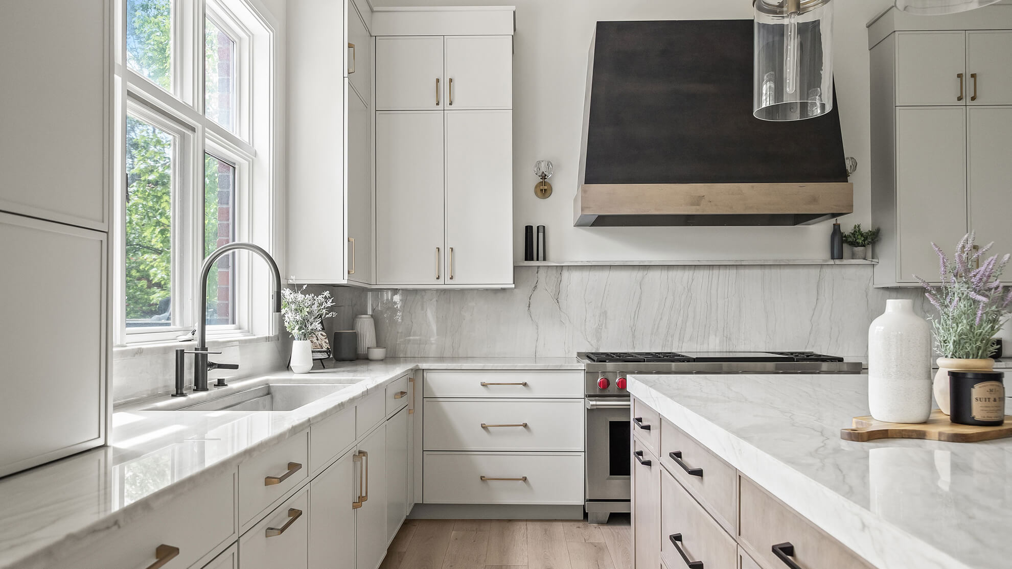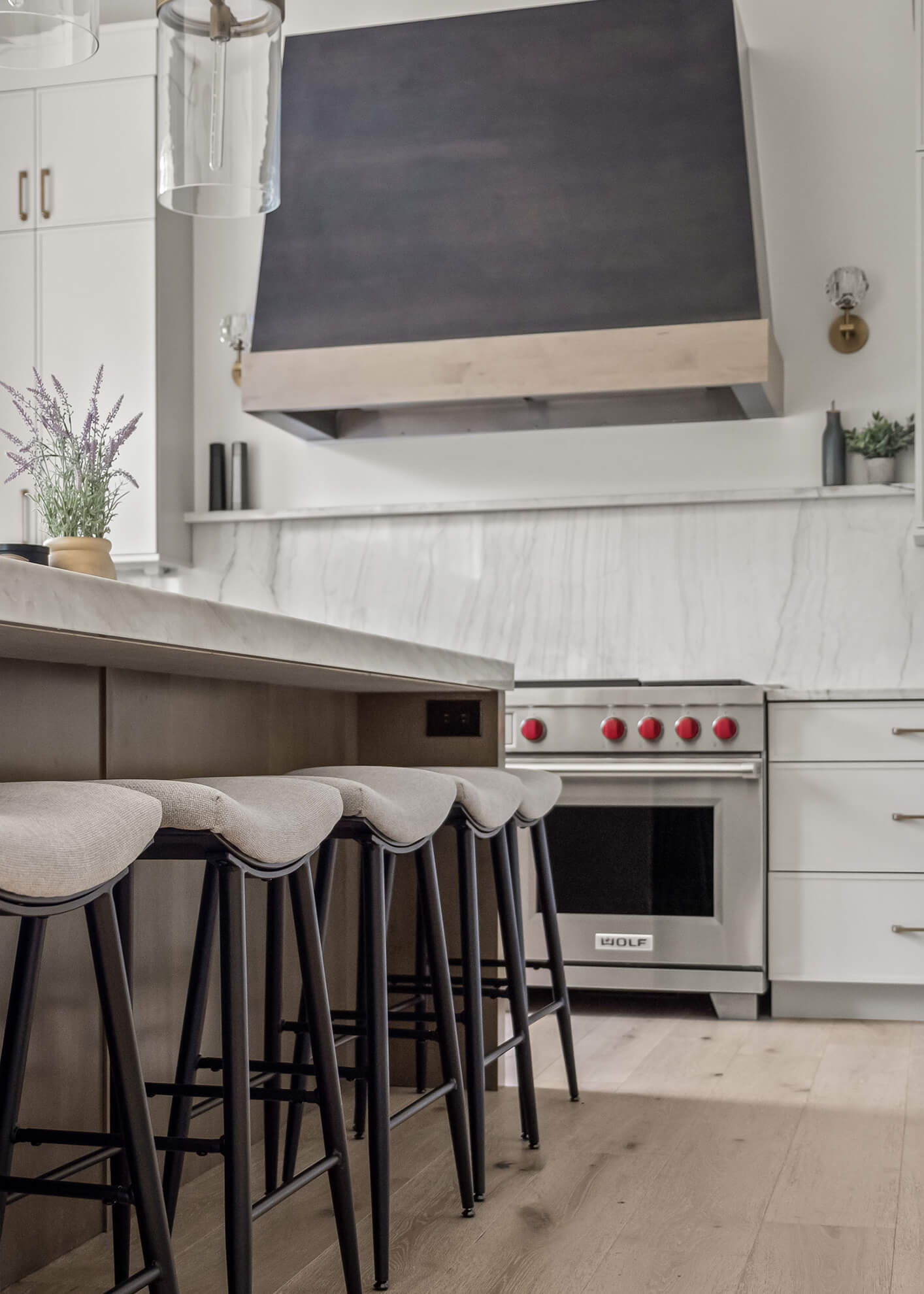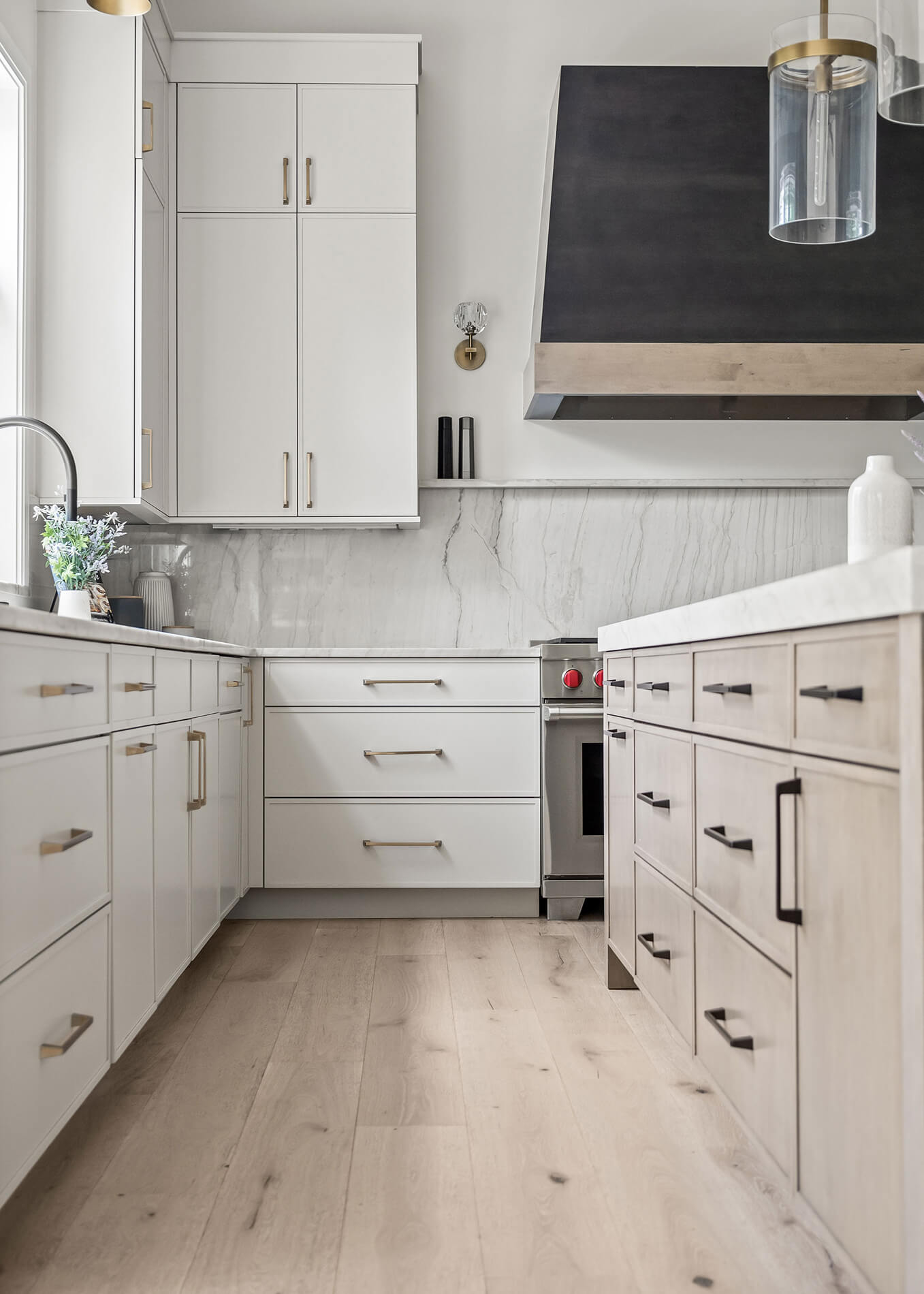 The lighting played a huge role in tying everything together, from pendants over the island to sconces above the sink and the hood.