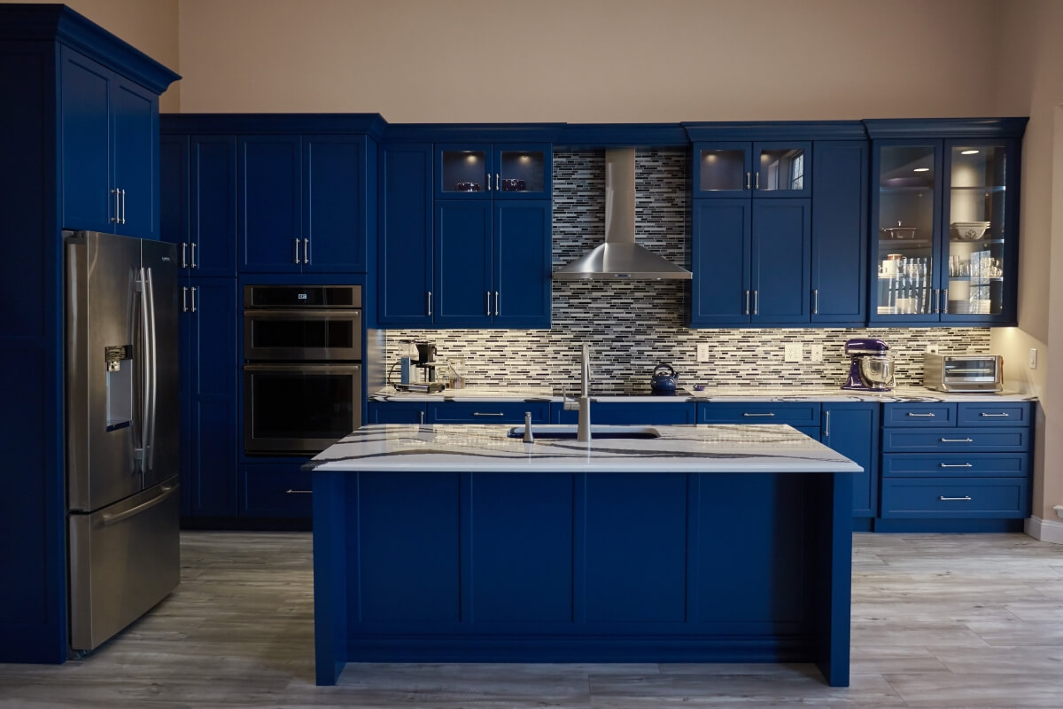 When asked where their inspiration came from for the kitchen’s beautiful, bold, blue hue, the Design Team replied, “We had freedom to play with unusual combinations of materials as the customer wanted to push the envelope. The Personal Paint Match option from Dura Supreme Cabinetry allowed us to offer this customer the exact blue desired, in this case, Sherwin Williams “Loyal Blue” SW 6510, which paired impeccably with the selected Cambria Bentley Quartz countertops and stainless steel KitchenAid appliances.
