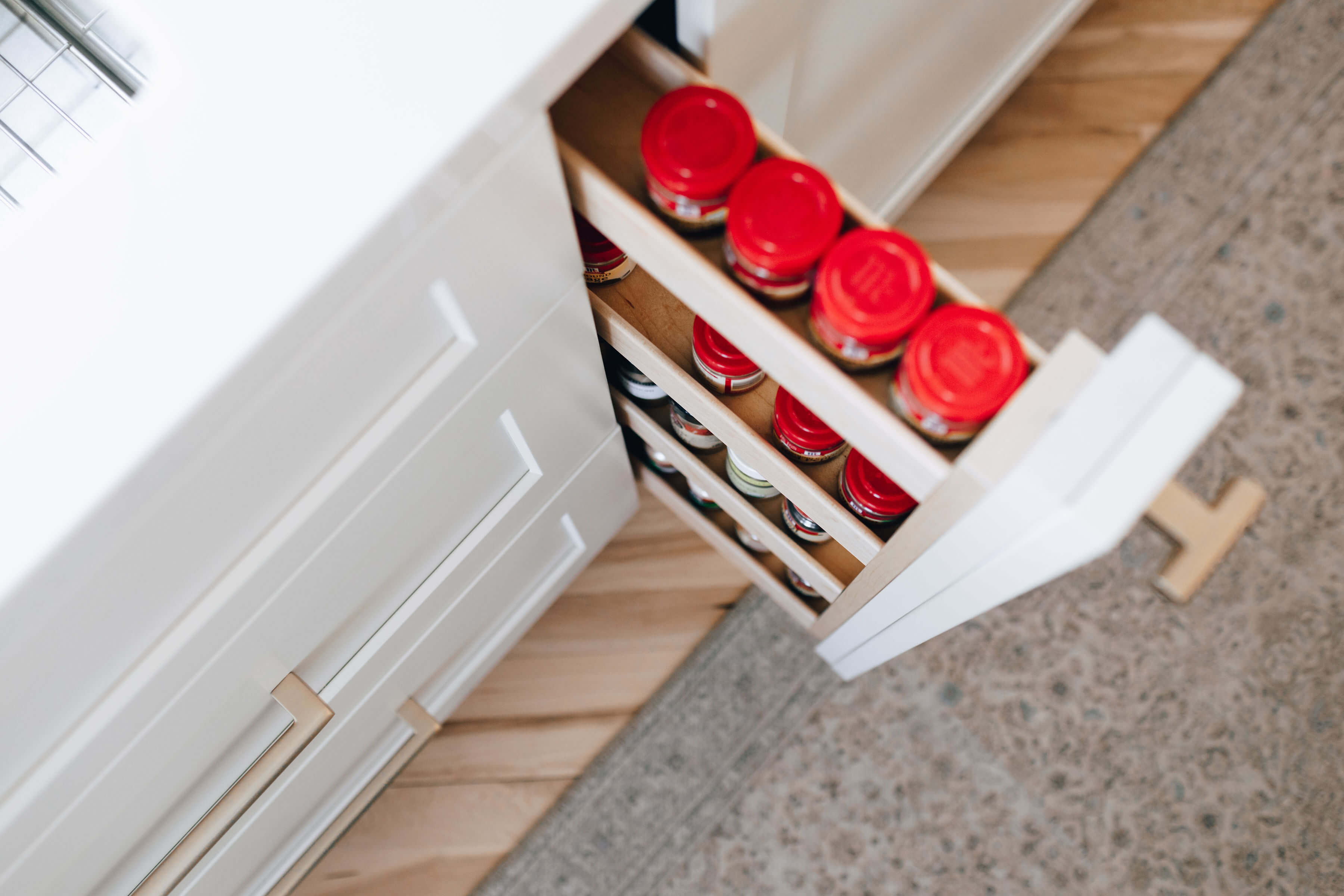 Organized spice storage was a must! Danielle added a thin pull-out spice rack next to the sink and directly across from the cooktop to provide easy access to the homeowner both while she prepares meals and while she cooks them.