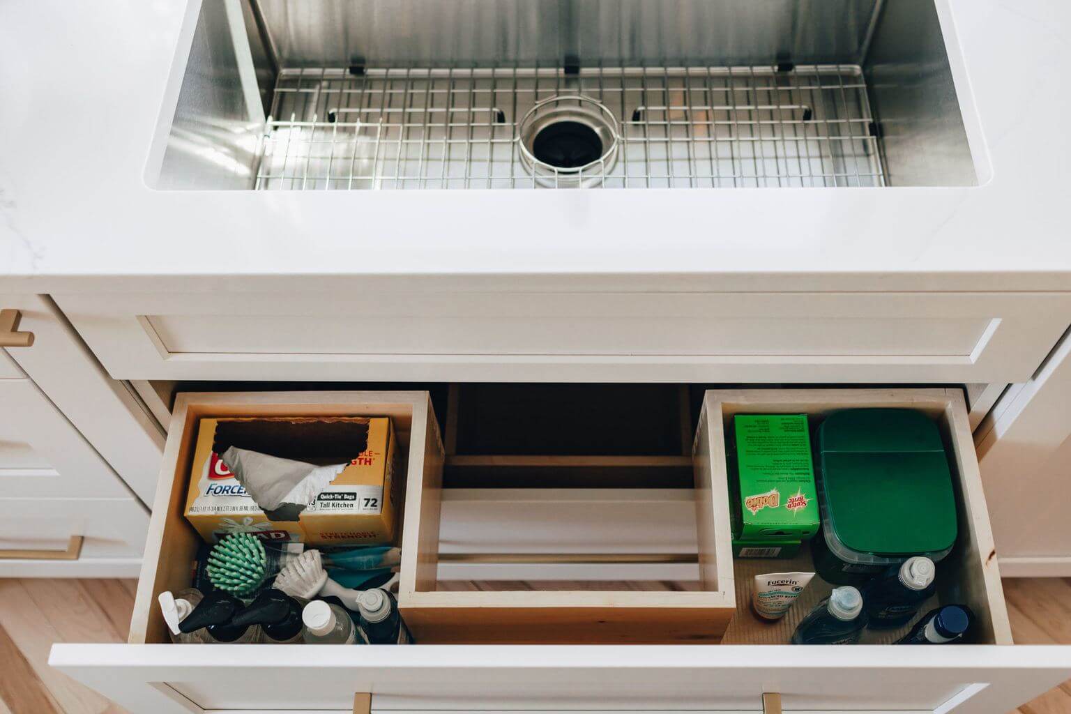 Another detail on the client’s “want” list was drawers under both the kitchen sink and under the cooktop. The drawers allow for efficient organization and easy accessibility for these aging-in-place clients.