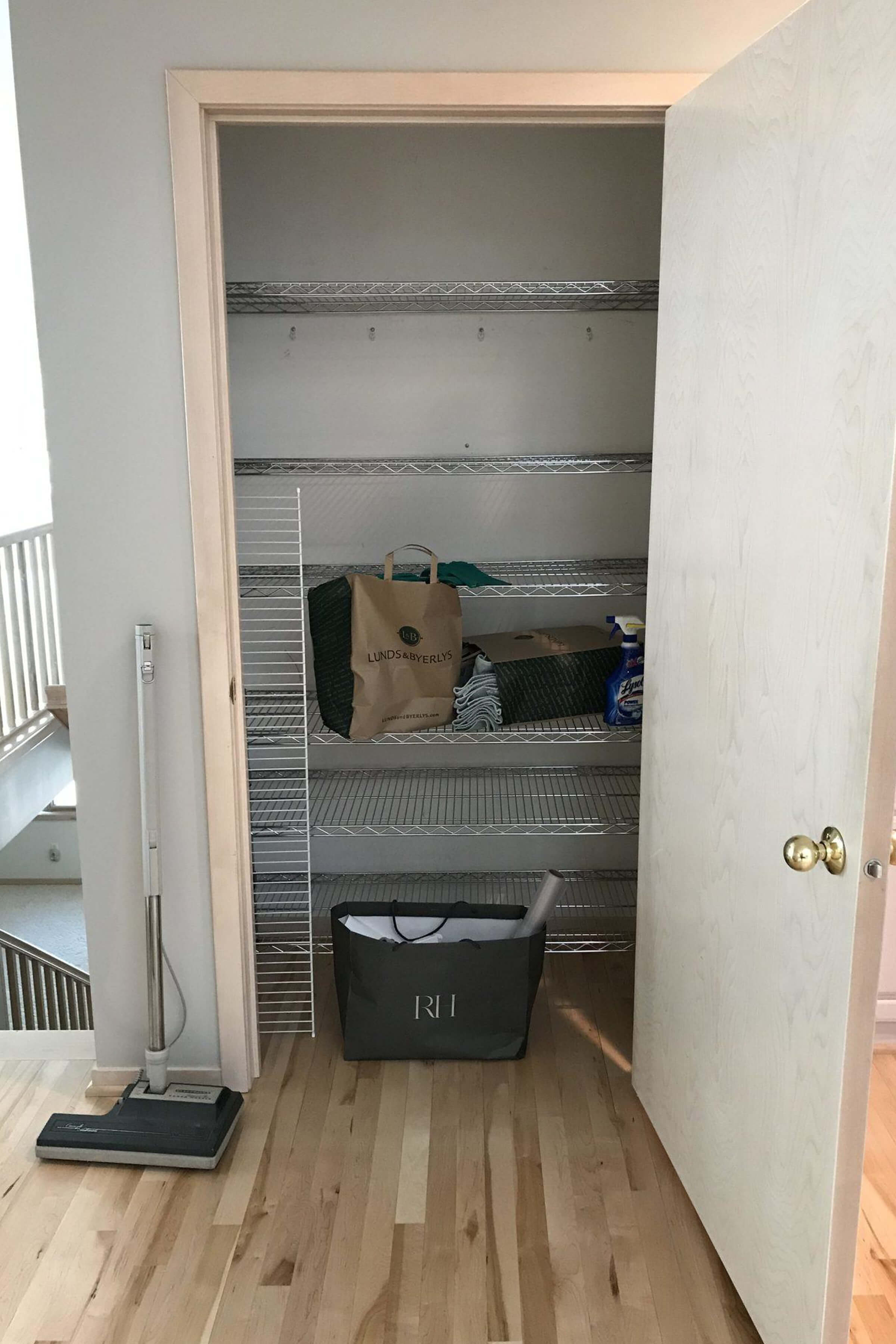 The pantry right off the kitchen started as a walk-in pantry with basic shelving and a standard door. The client felt that it wasn’t utilizing the space very well and disliked the big door that swung open. Danielle was able to design an integrated tall pantry cabinet with roll-outs for improved functionality. A specific request for the pantry was that the client would have a place to unload her groceries. An additional flat roll-out shelf was configured for her to do just that!