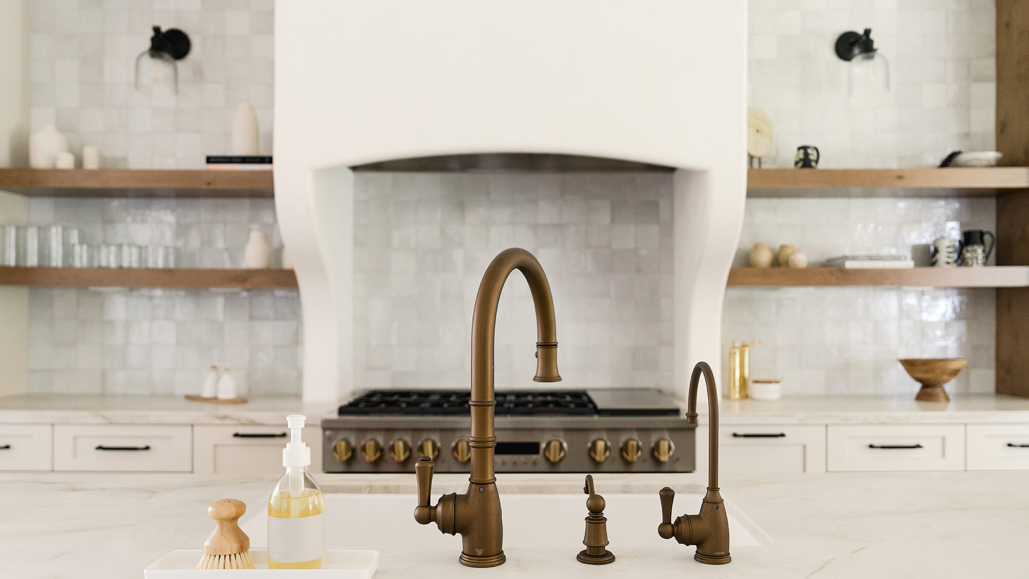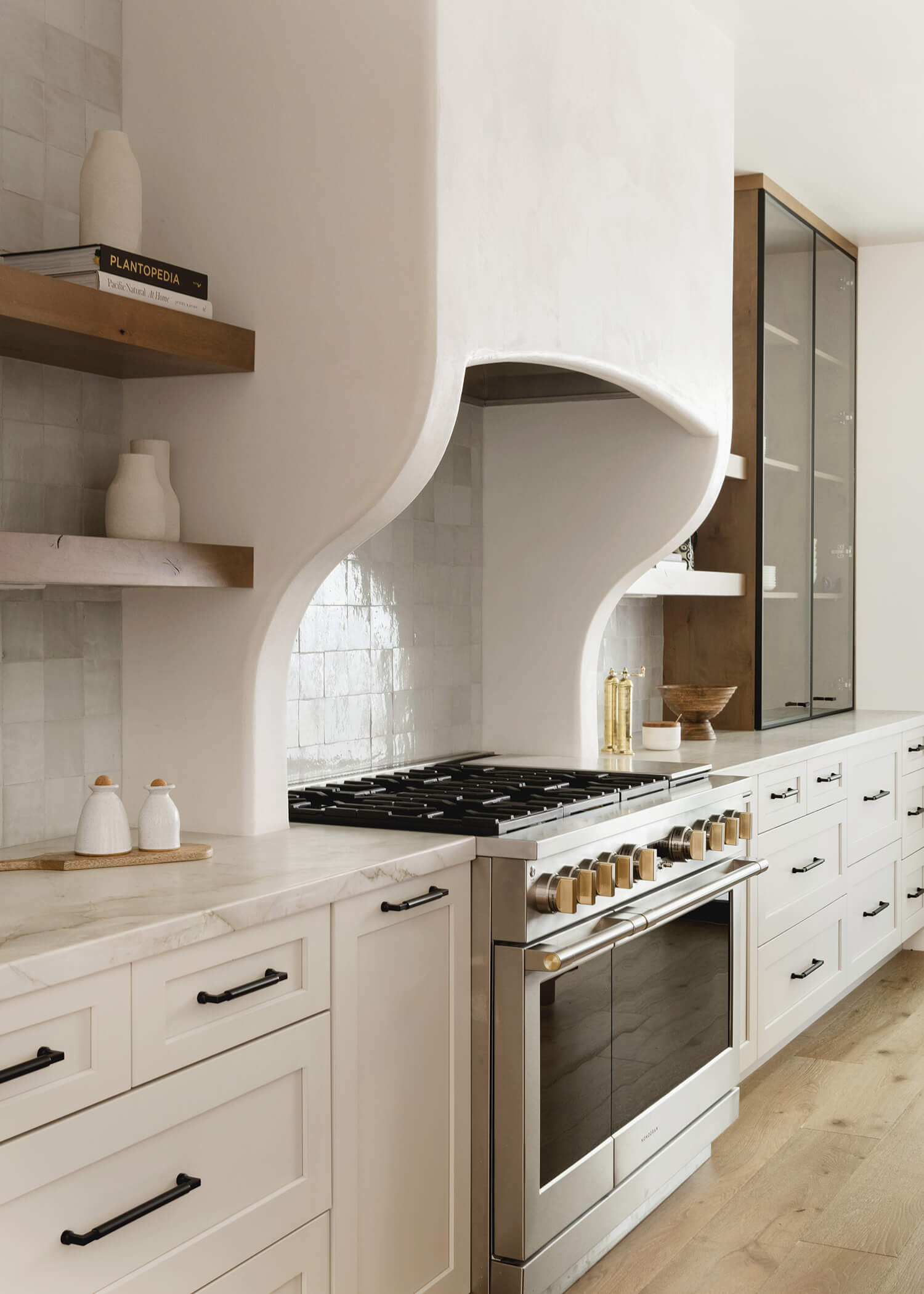 The plaster hood was custom-designed and handcrafted to have the look of a timeless Mediterranean kitchen of the past.