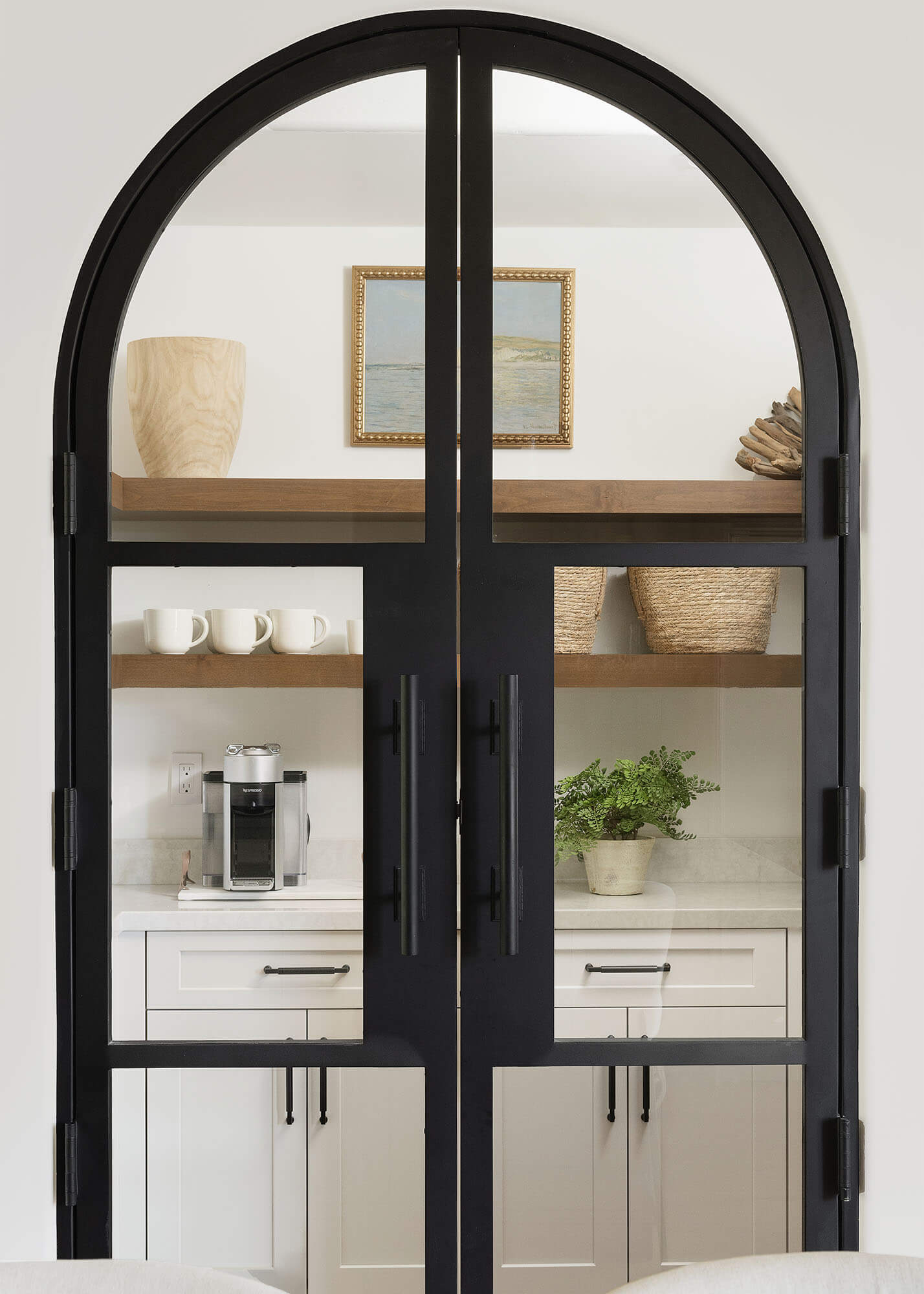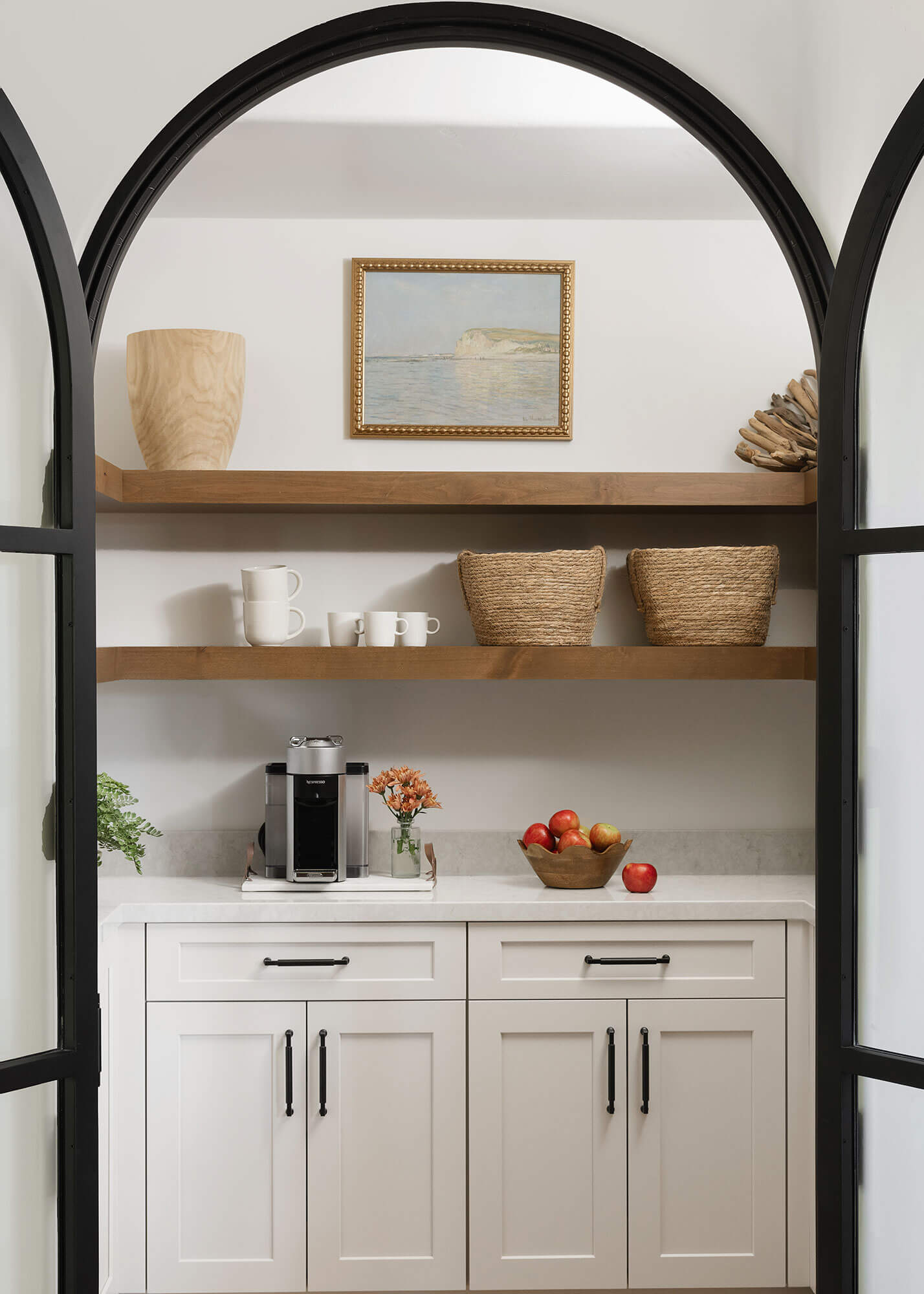 An elegant walk-in pantry, featuring a coffee bar station, is accentuated with beautiful, arched, black-framed glass doors. This addition provides the family with ample hidden, functional storage and creates a dedicated space for brewing coffee.