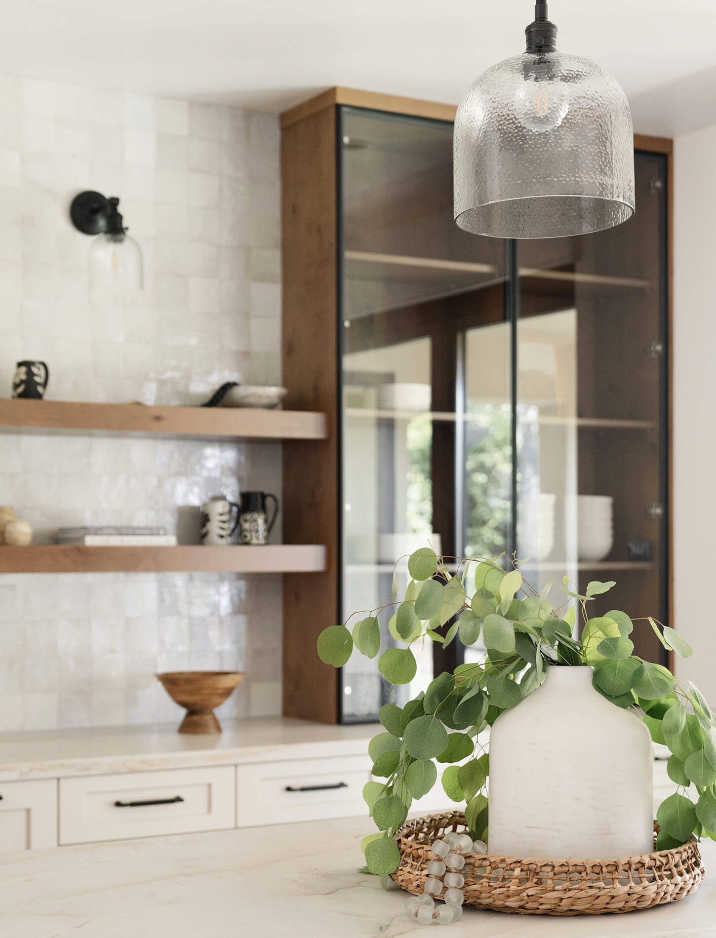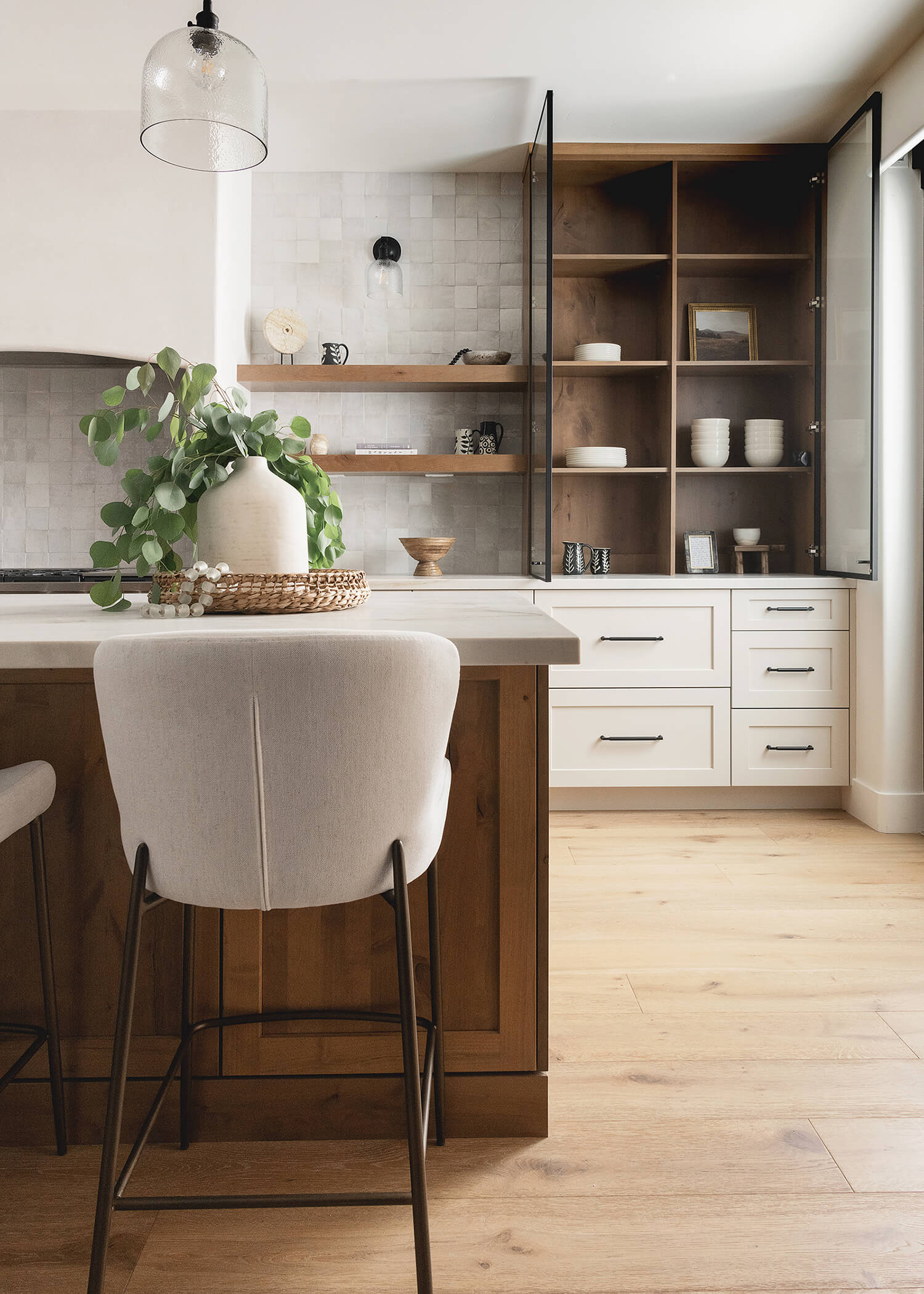 Dramatic black accents are also incorporated sporadically throughout the interior design. You’ll find accents of black on the glass cabinet doors and arched pantry doors, the cabinet hardware, light fixtures, staircase, etc., throughout the space.