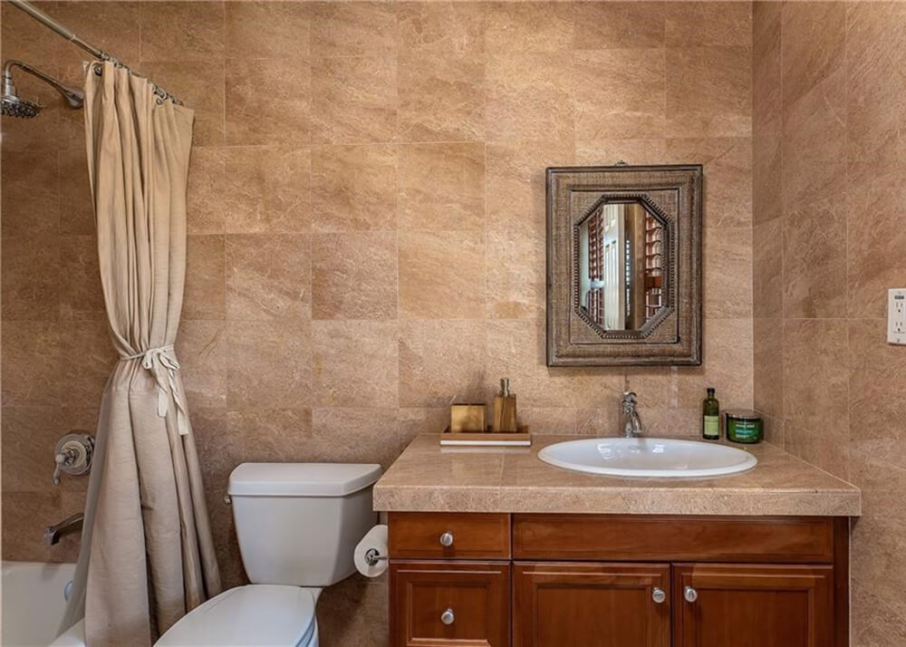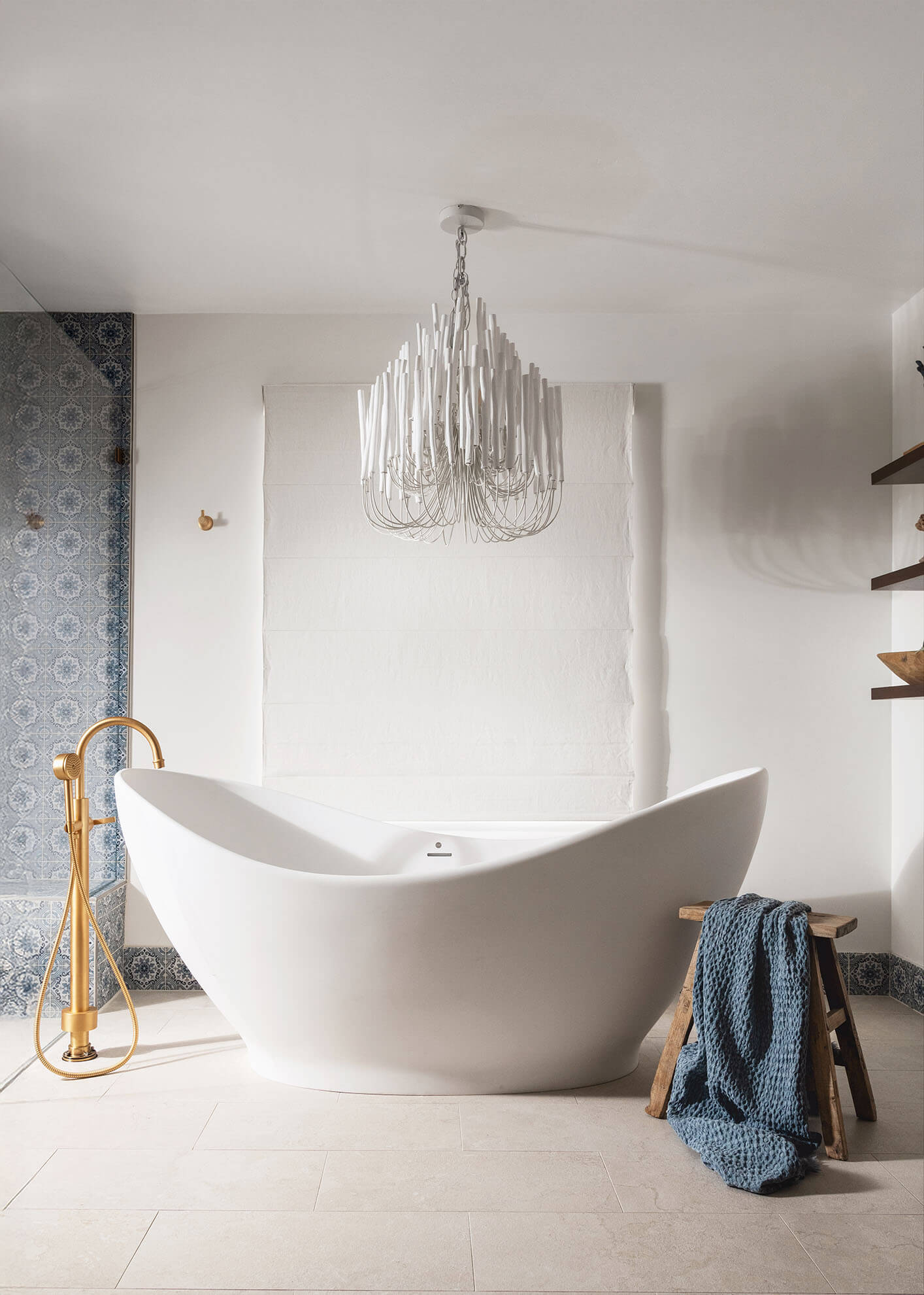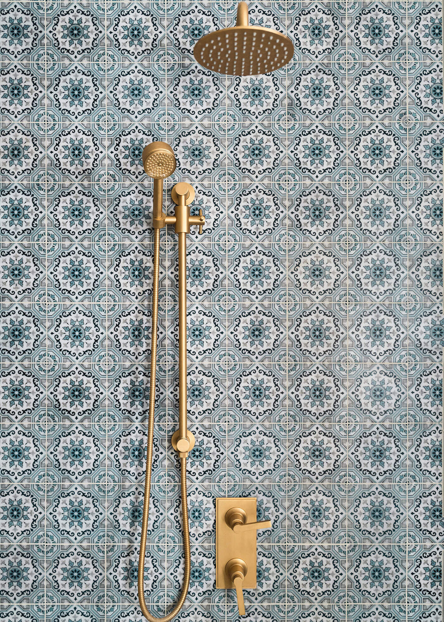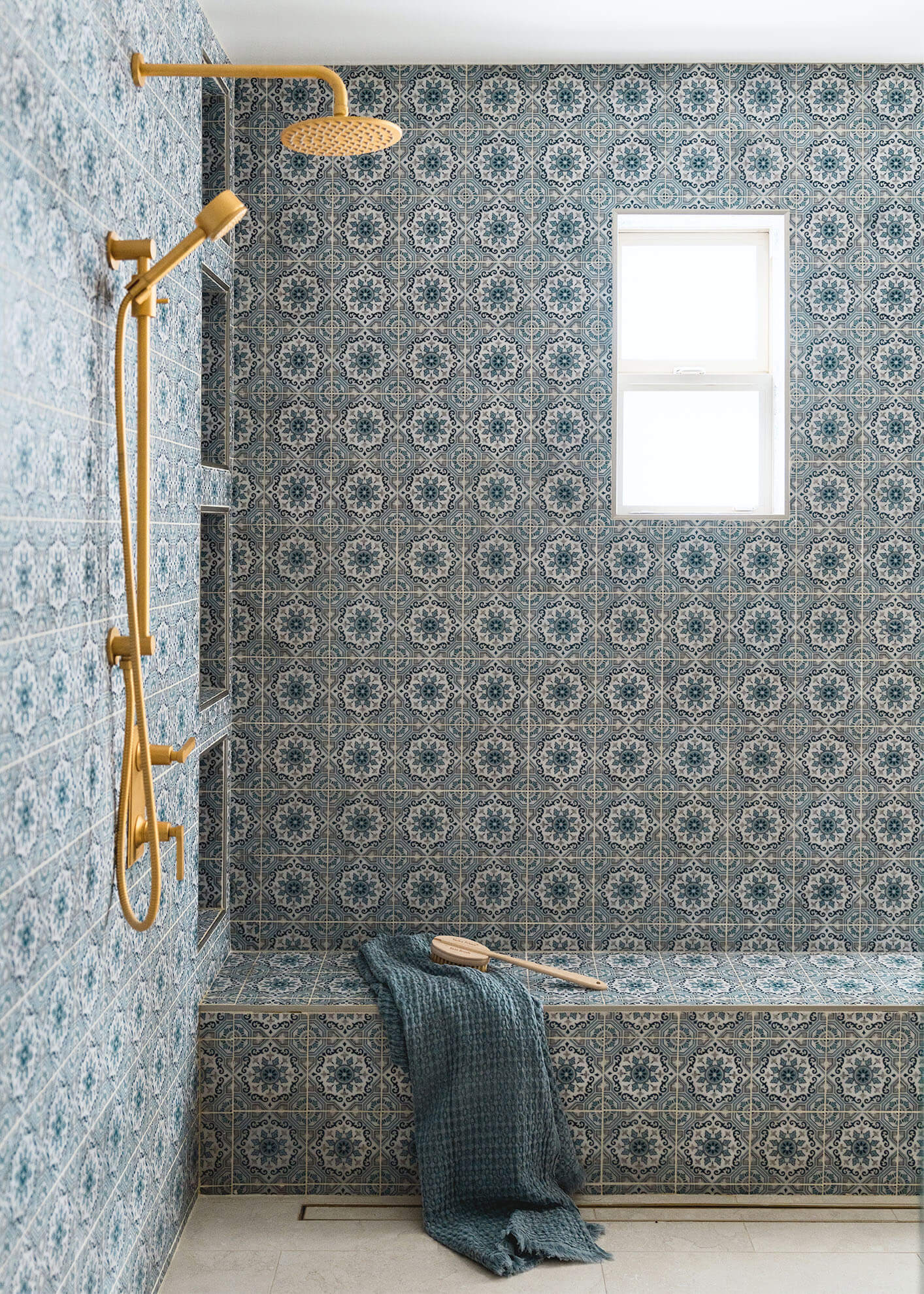 Every Mediterranean style home needs a splash of tile! In this bathroom design, the blue and white hand-painted tiles give the room a strong Mediterranean vibe.