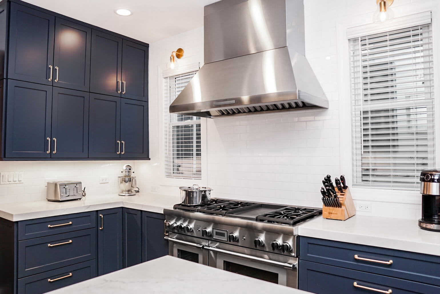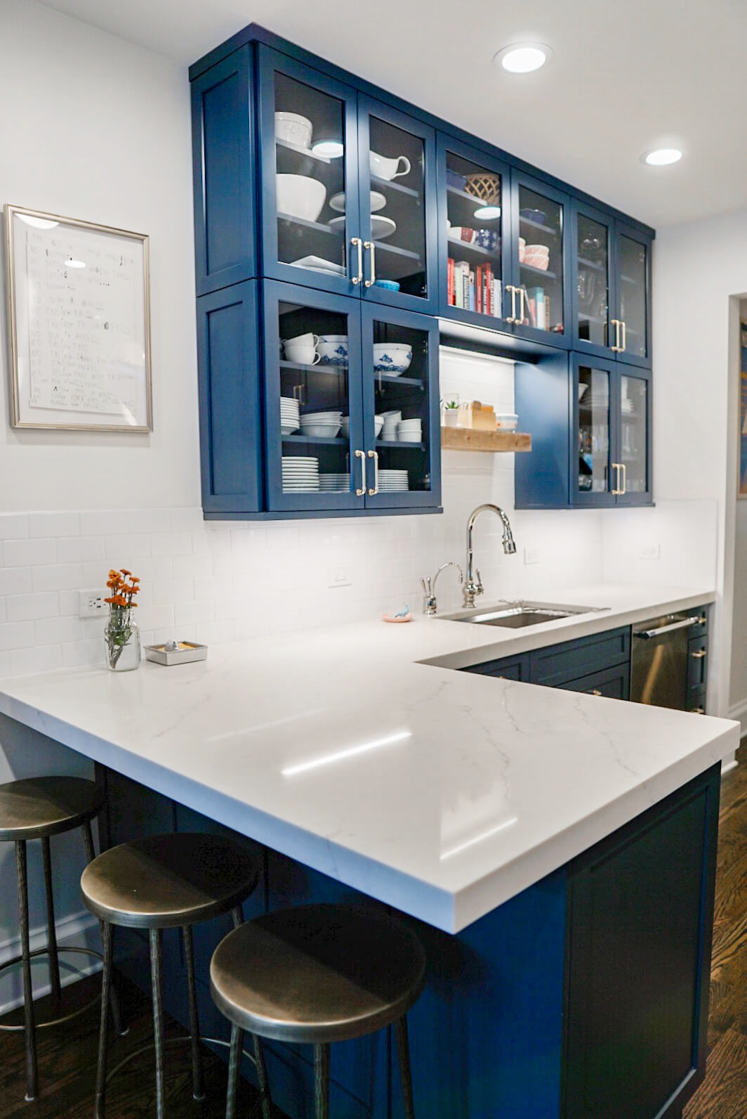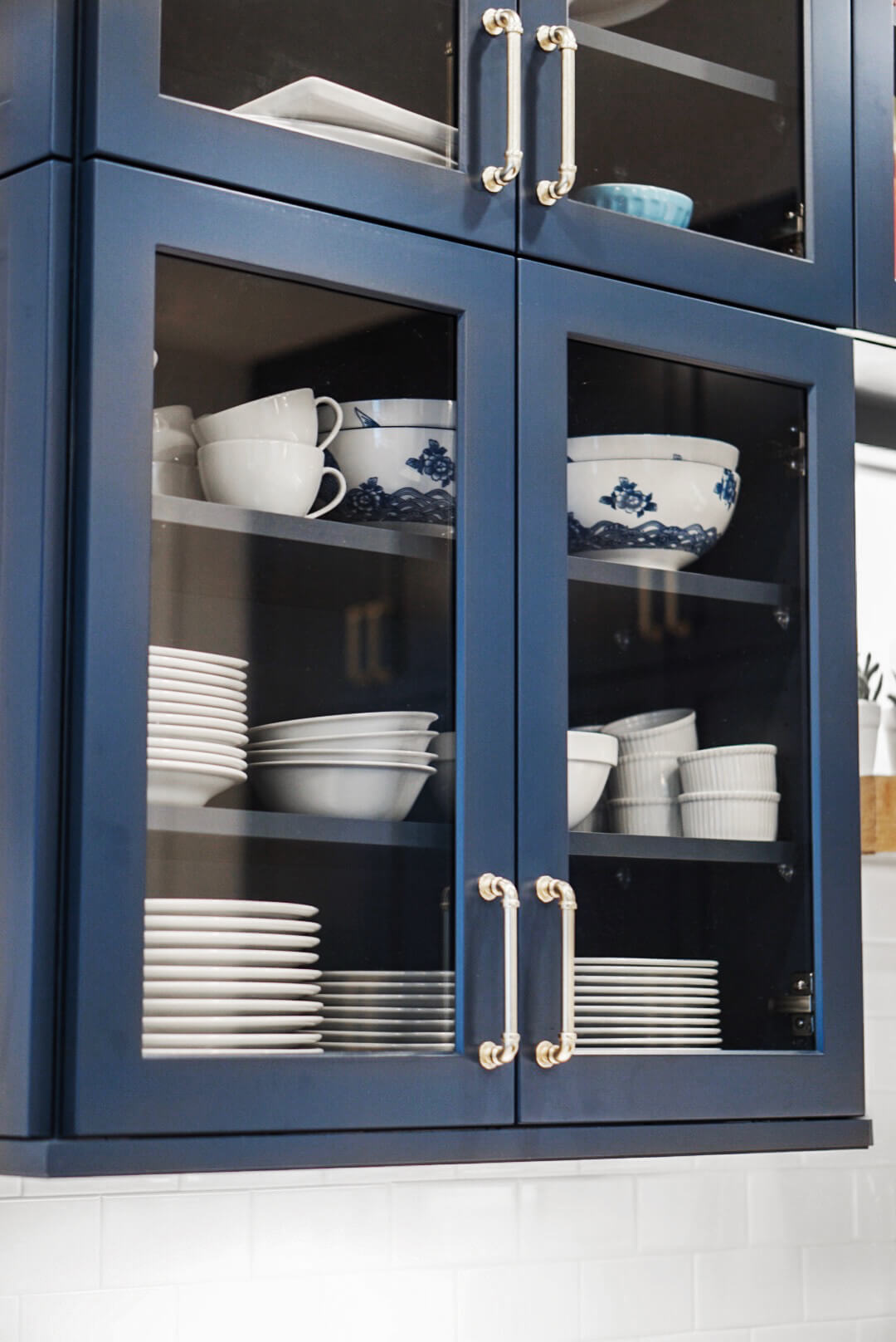 To balance the darkness of the navy blue cabinets, Lauren selected a simple yet bright subway tile in white which stretches from countertop to ceiling on the range wall.