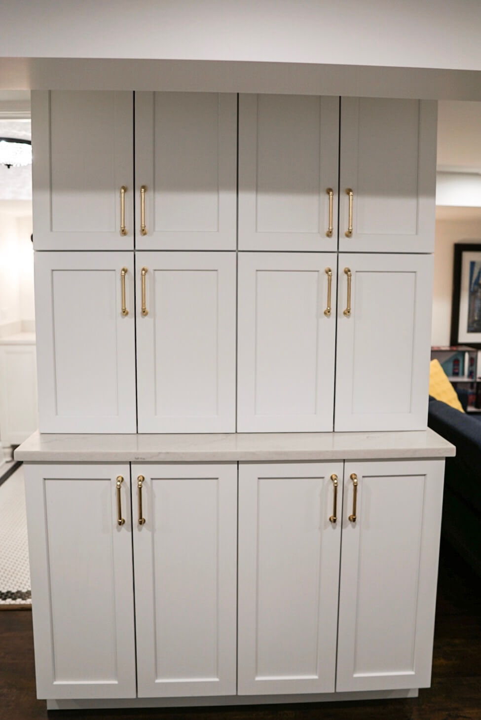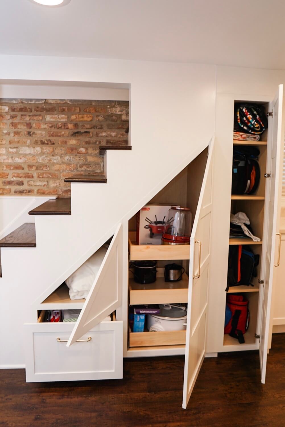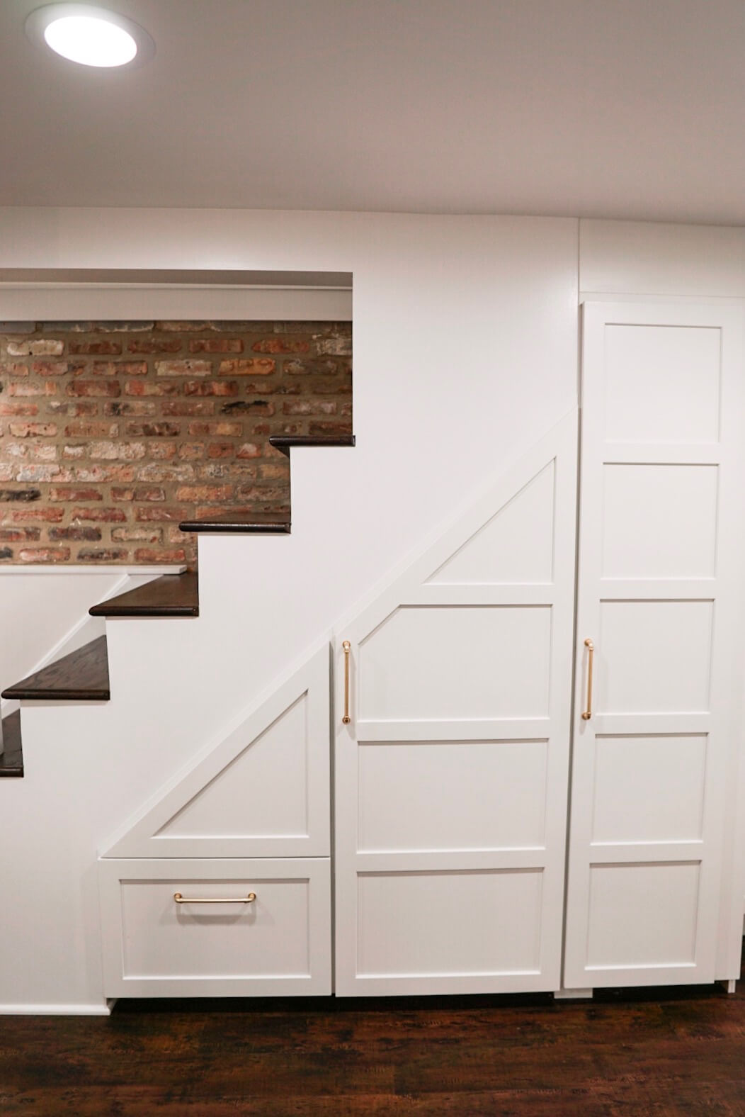Lauren created cabinet storage underneath the basement staircase to optimize the rarely used storage space. She worked side by side with the contractor to ensure the cabinet doors lined up and opened with the staircase’s structural beams. Lauren also designed the cabinet door rails under the stairs to line up parallel and consistently to match the 5-panel doors throughout the rest of the house. The new cabinet storage provides the perfect space for all those odds and end items you never know where to put.