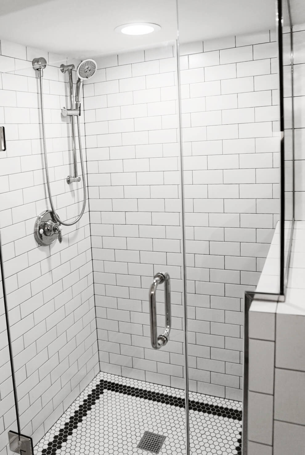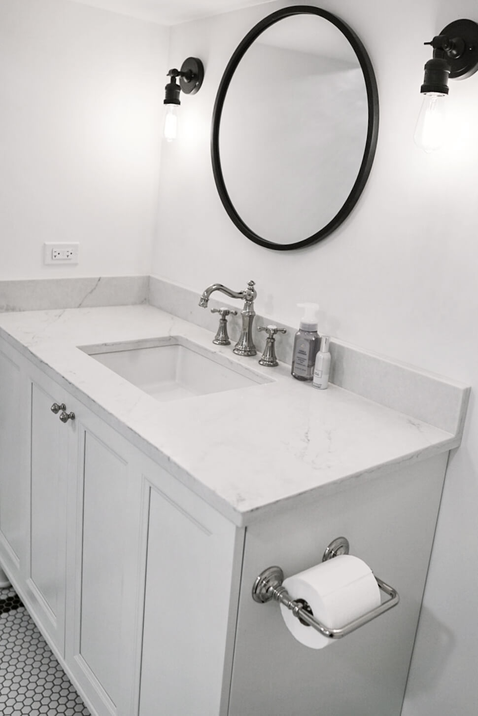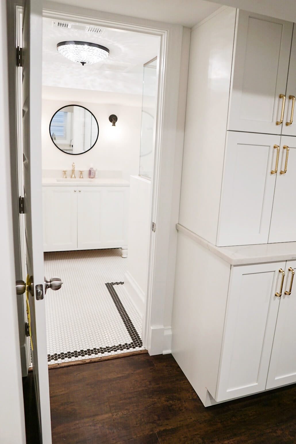Last but not least, the basement bathroom was also renovated with a bright white color scheme with accents of black. You’d never guess this bright and lively room was a windowless basement bathroom.