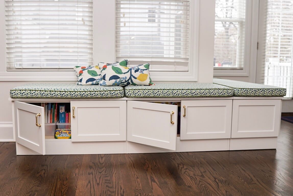 In the same room as the entertainment center is a cozy L-shaped boot bench that wraps around the corner connecting the entryway to this newly created family room. The boot bench was designed to be moveable and easy for the family to relocate seasonally to make way for the Christmas tree. The side closest to the entry houses shoes and boots while the side facing the entertainment center holds books and school supplies.