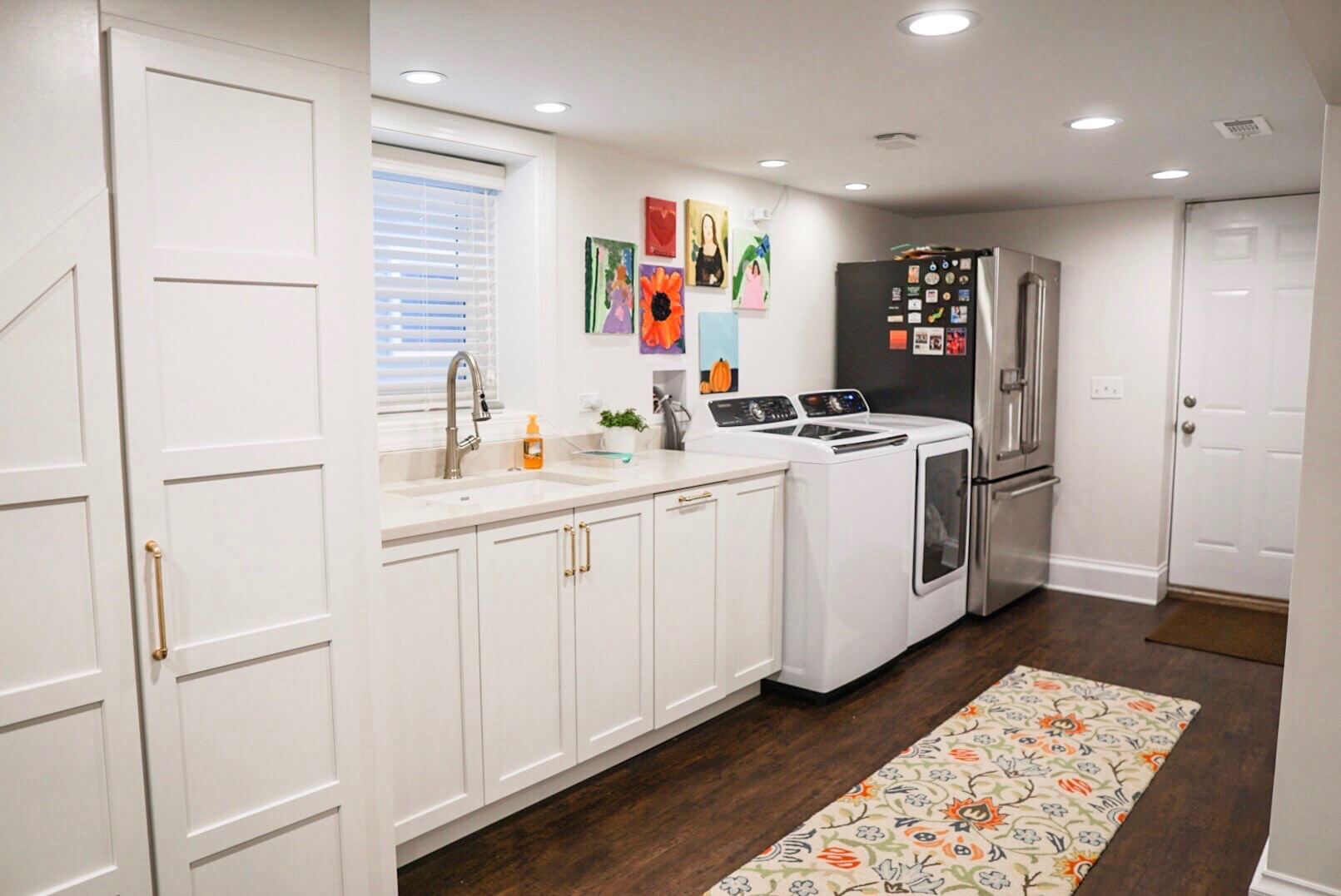 Adjacent to the basement staircase is the laundry room, which was upgraded with coordinating cabinetry and a large washing station. A fridge was included for additional freezer space and to store snacks and beverages near the entertainment room for the kids.