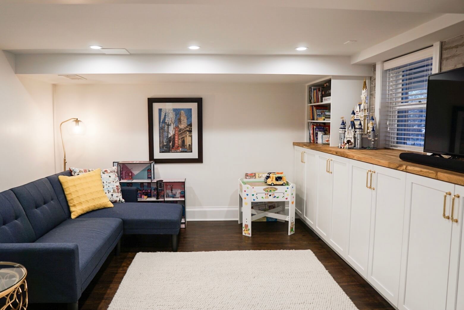 The basement living space created for the kids features a full-wall-length entertainment center designed to hold electronics, more board games, and toys. A cozy navy blue couch was selected to pull the color theme from the upstairs into the lower level.