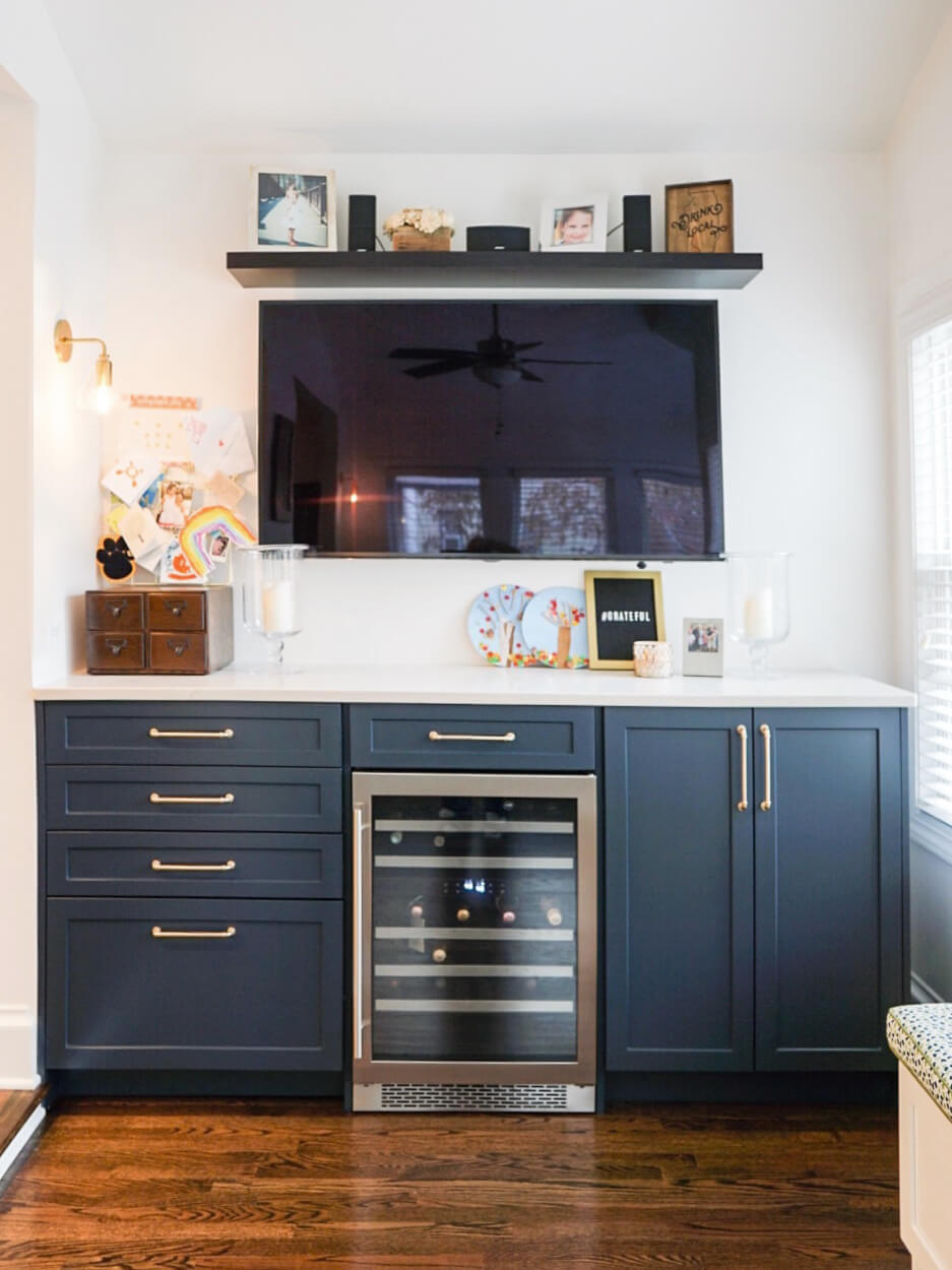 The room to the side of the kitchen leading to the main entryway of the house was re-designed with a quaint blue entertainment center designed to bring the whole family together for game nights and crafting parties. To the left of the wine fridge are several drawers dedicated to storing their collection of crafting supplies. The top middle drawer above the wine fridge provides easy access to beverage serving supplies like wine bottle openers and accessories. To the right is a cabinet used to store all of the family’s favorite board games.