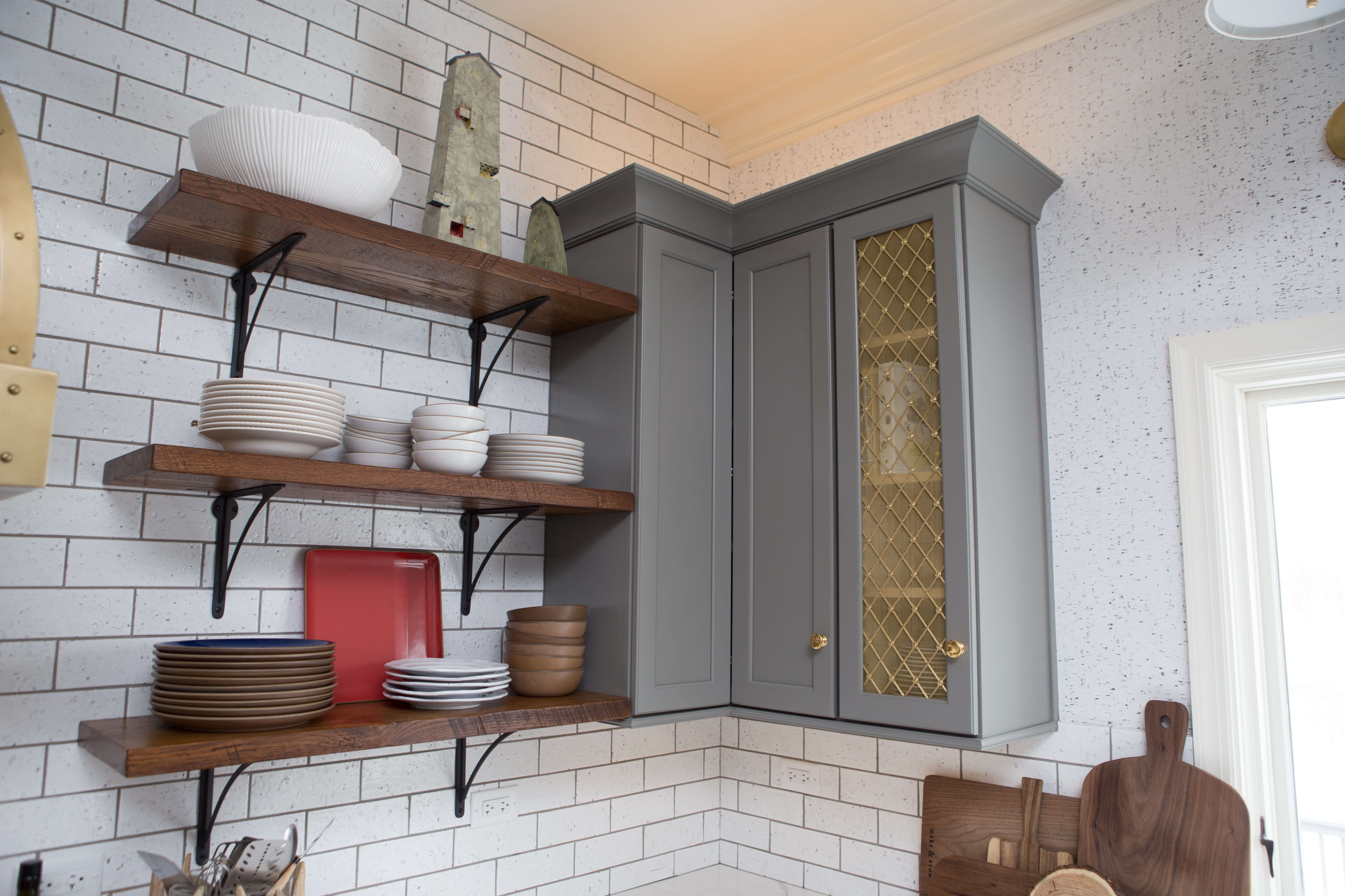 Decorative brass mesh inserts complement the beautiful Dura Supreme cabinets in the Kendall door style in a painted gray finish.