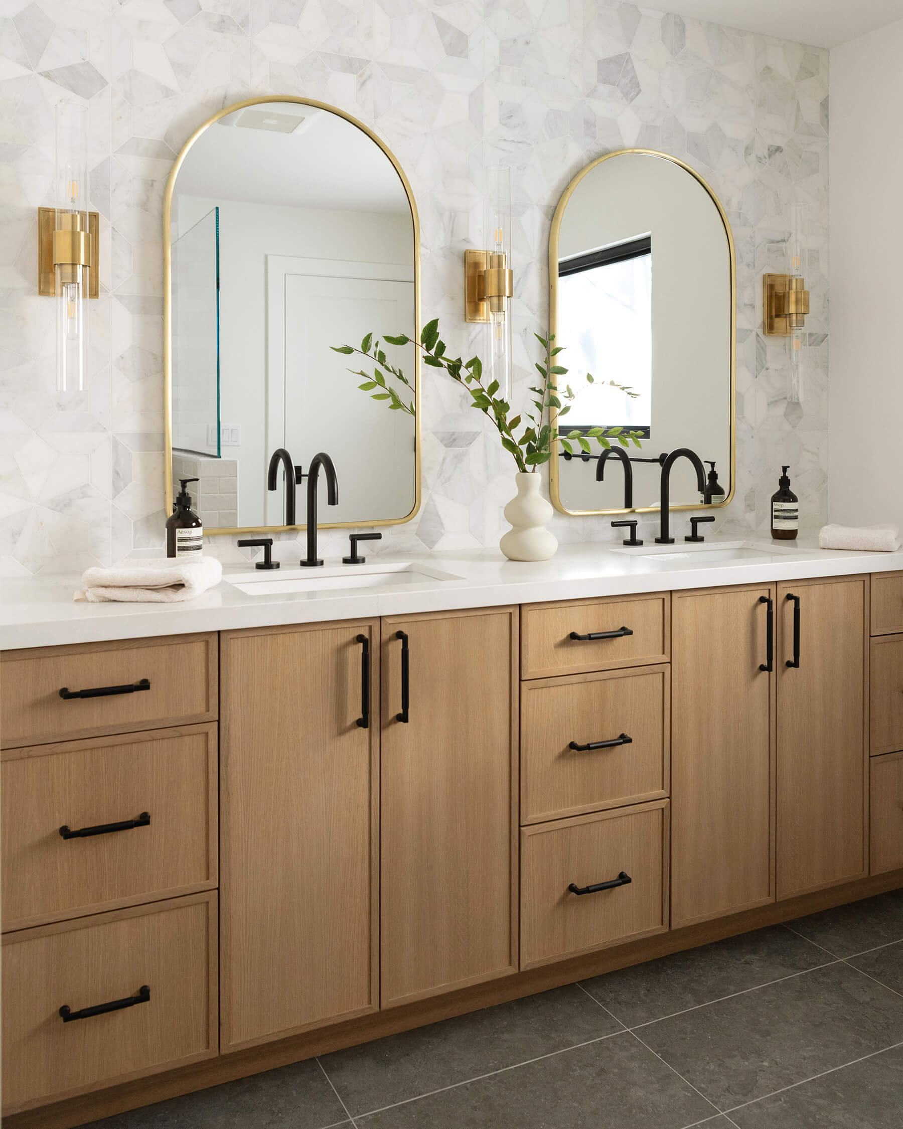This bathroom features Dura Supreme’s slab door, Moda-Horizontal, with a horizontal grain pattern in a “Natural” finish on the Quarter-Sawn White Oak wood species. Bathroom design by Honeycomb Home Design of Arroyo Grande, California. Photo by Lisa Maksoudian.
